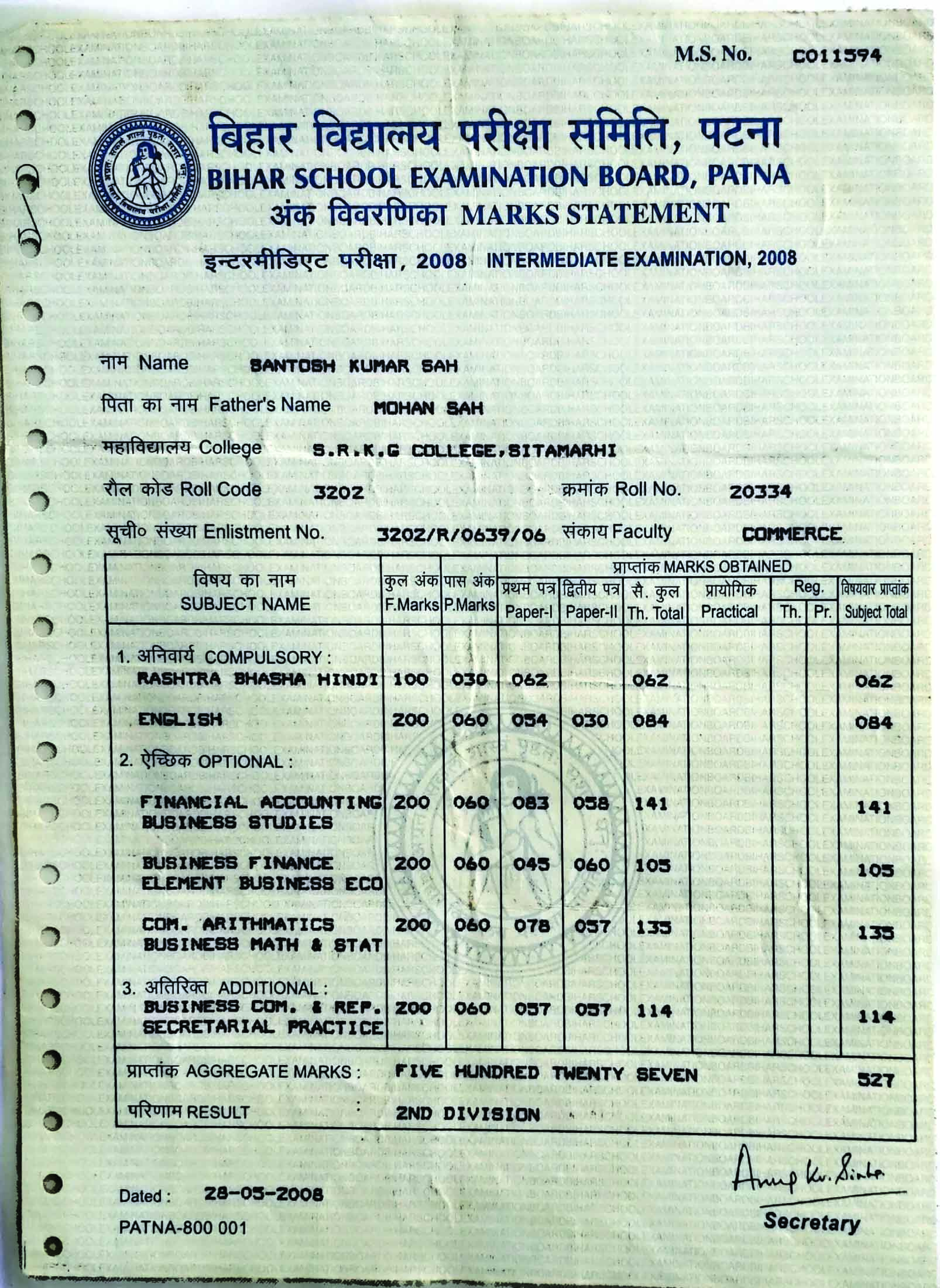 | Exam | Full Marks | Pass Marks | Marks Obtained |