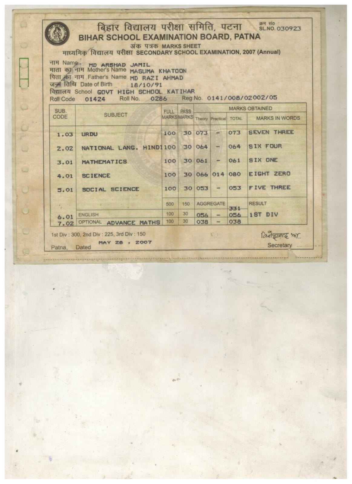 | Exam | Full Marks | Pass Marks | Marks Obtained |