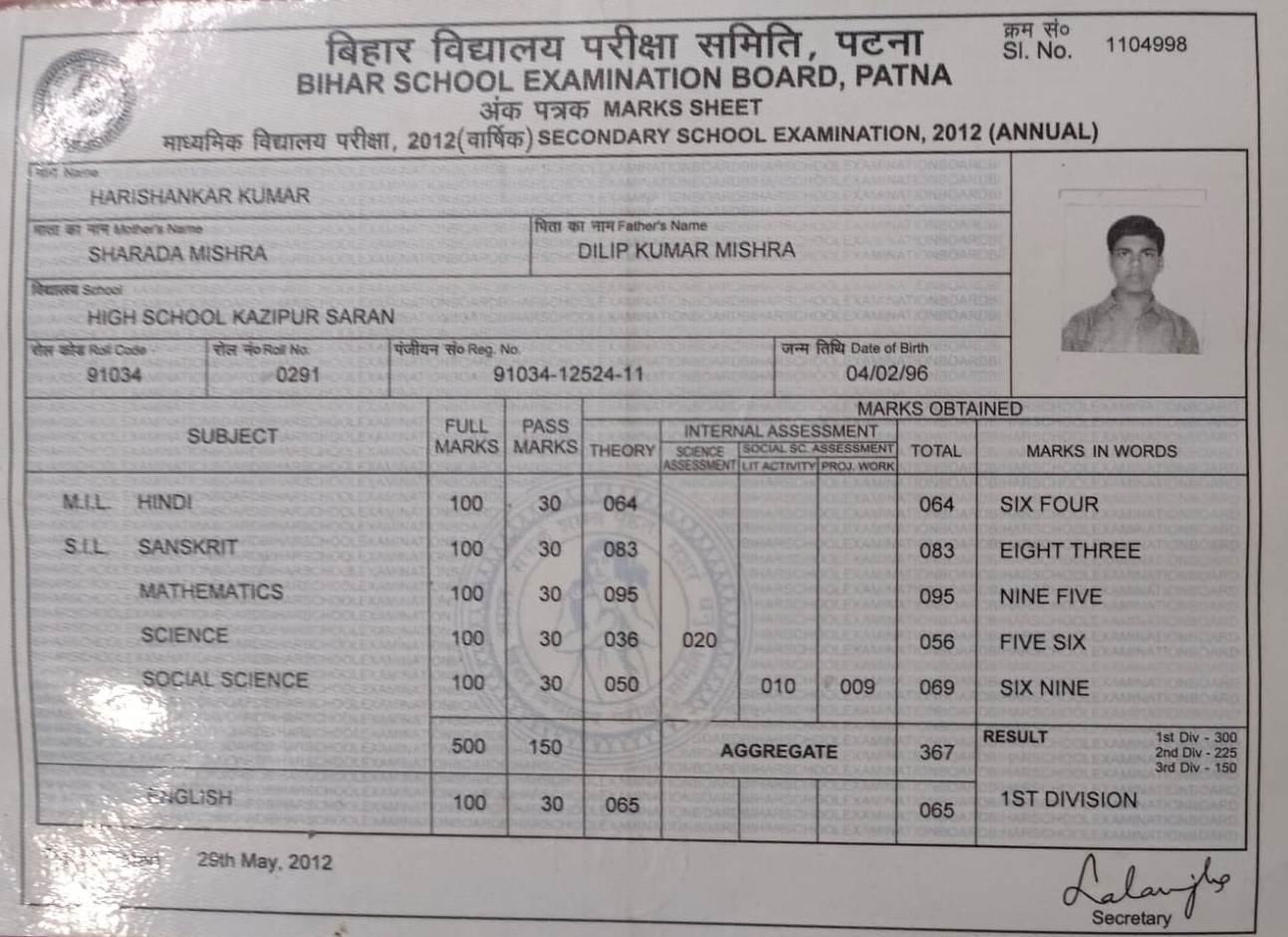 | Exam | Full Marks | Pass Marks | Marks Obtained |