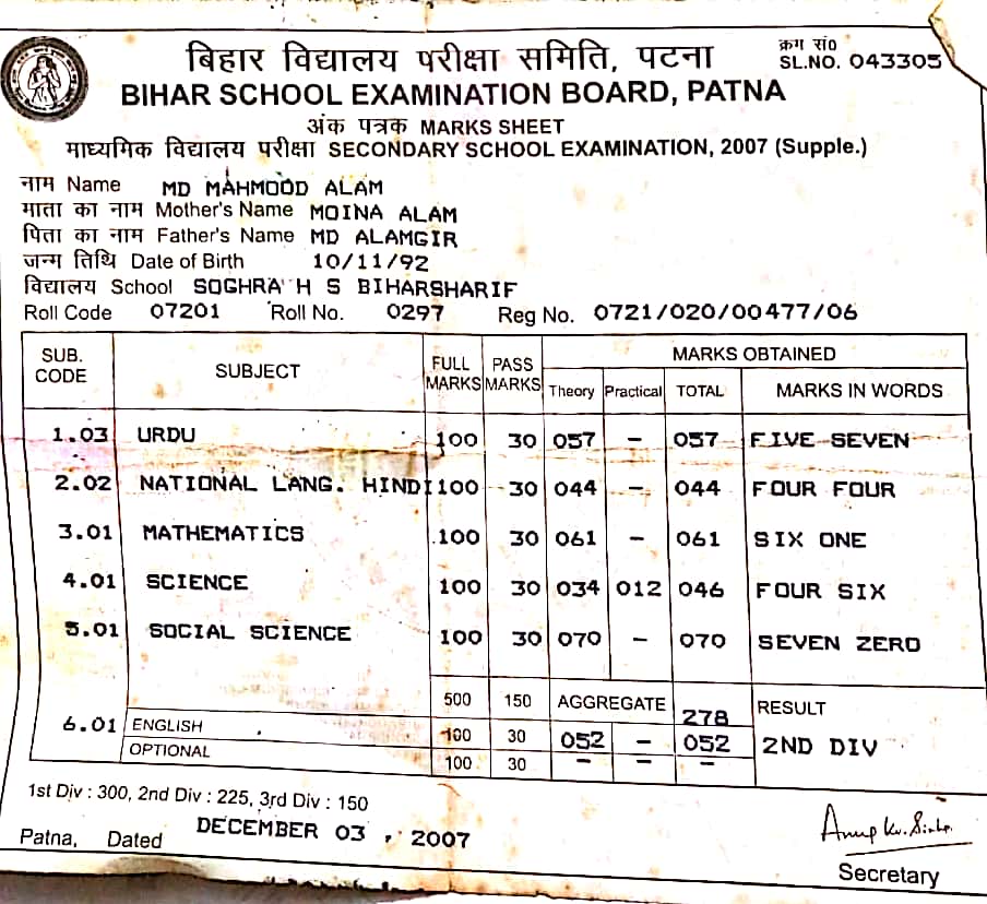 | Exam | Full Marks | Pass Marks | Marks Obtained |