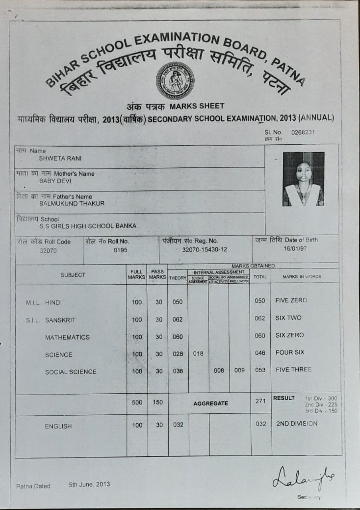 | Exam | Full Marks | Pass Marks | Marks Obtained |