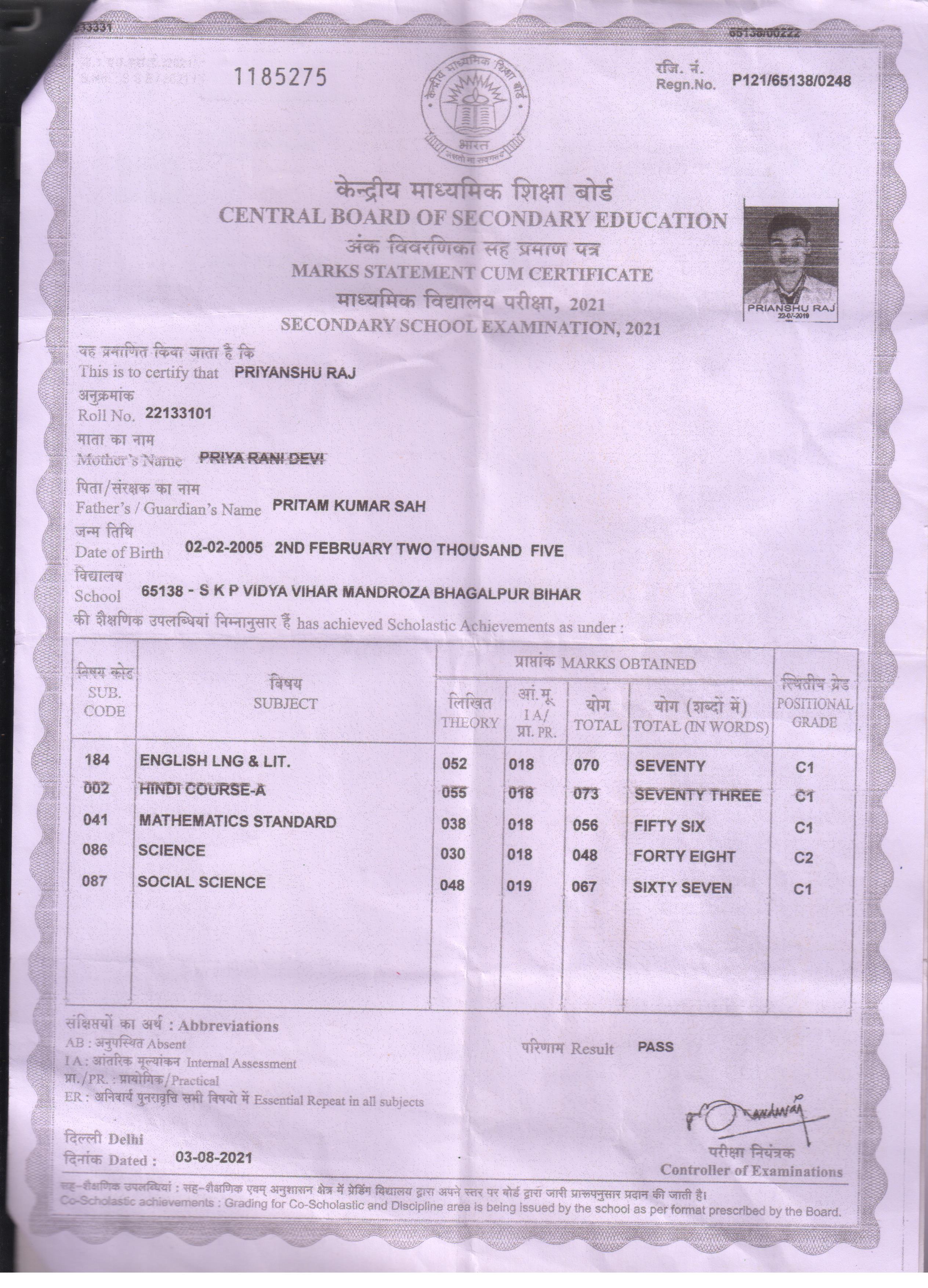 | Exam | Full Marks | Pass Marks | Marks Obtained |