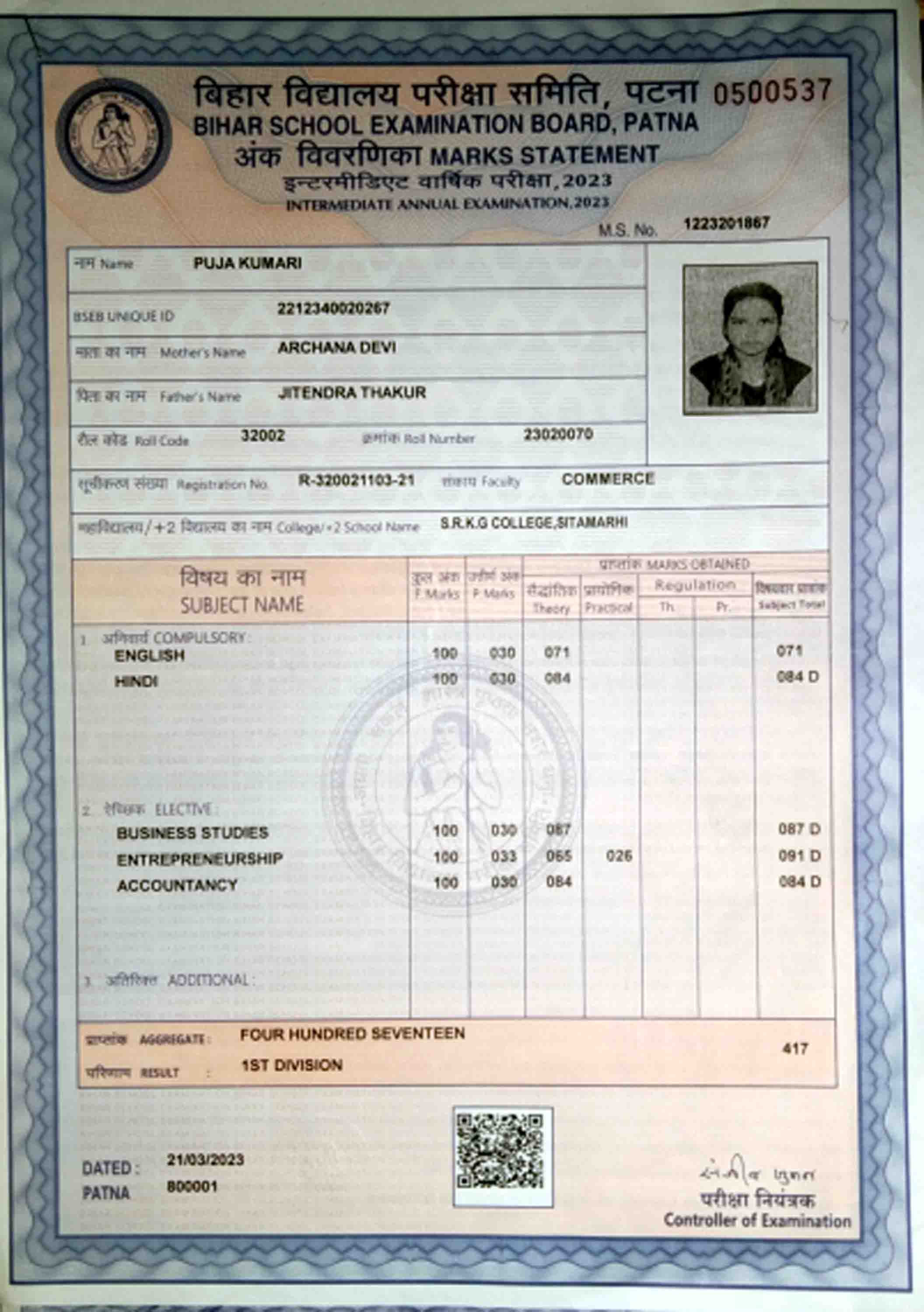 | Exam | Full Marks | Pass Marks | Marks Obtained |