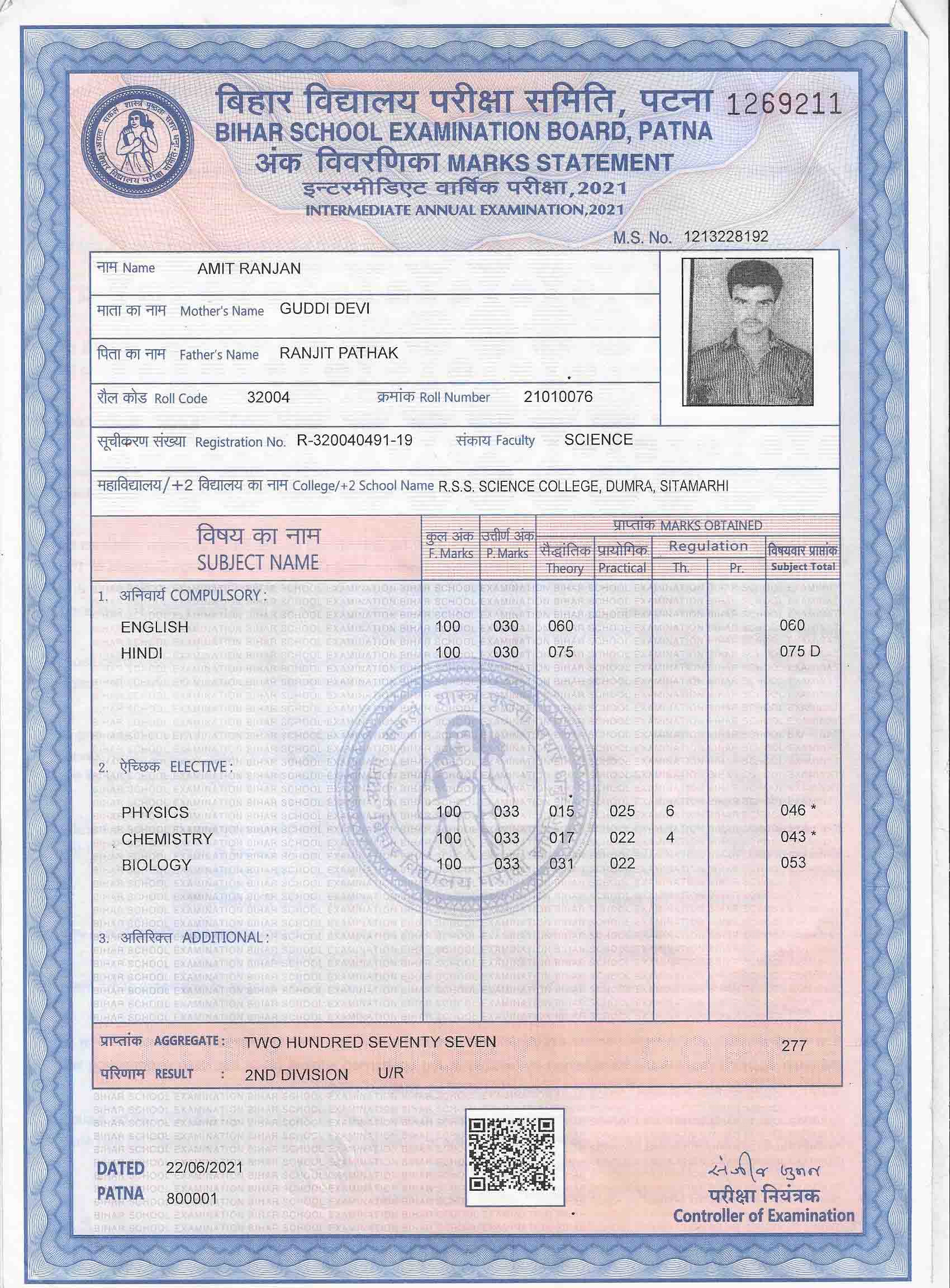 | Exam | Full Marks | Pass Marks | Marks Obtained |