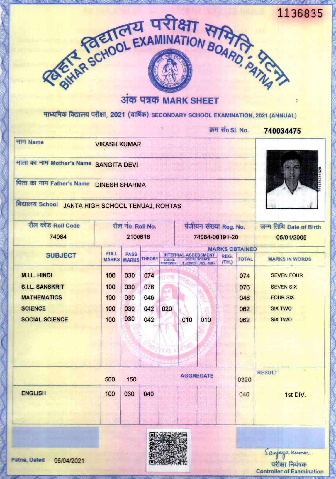| Exam | Full Marks | Pass Marks | Marks Obtained |