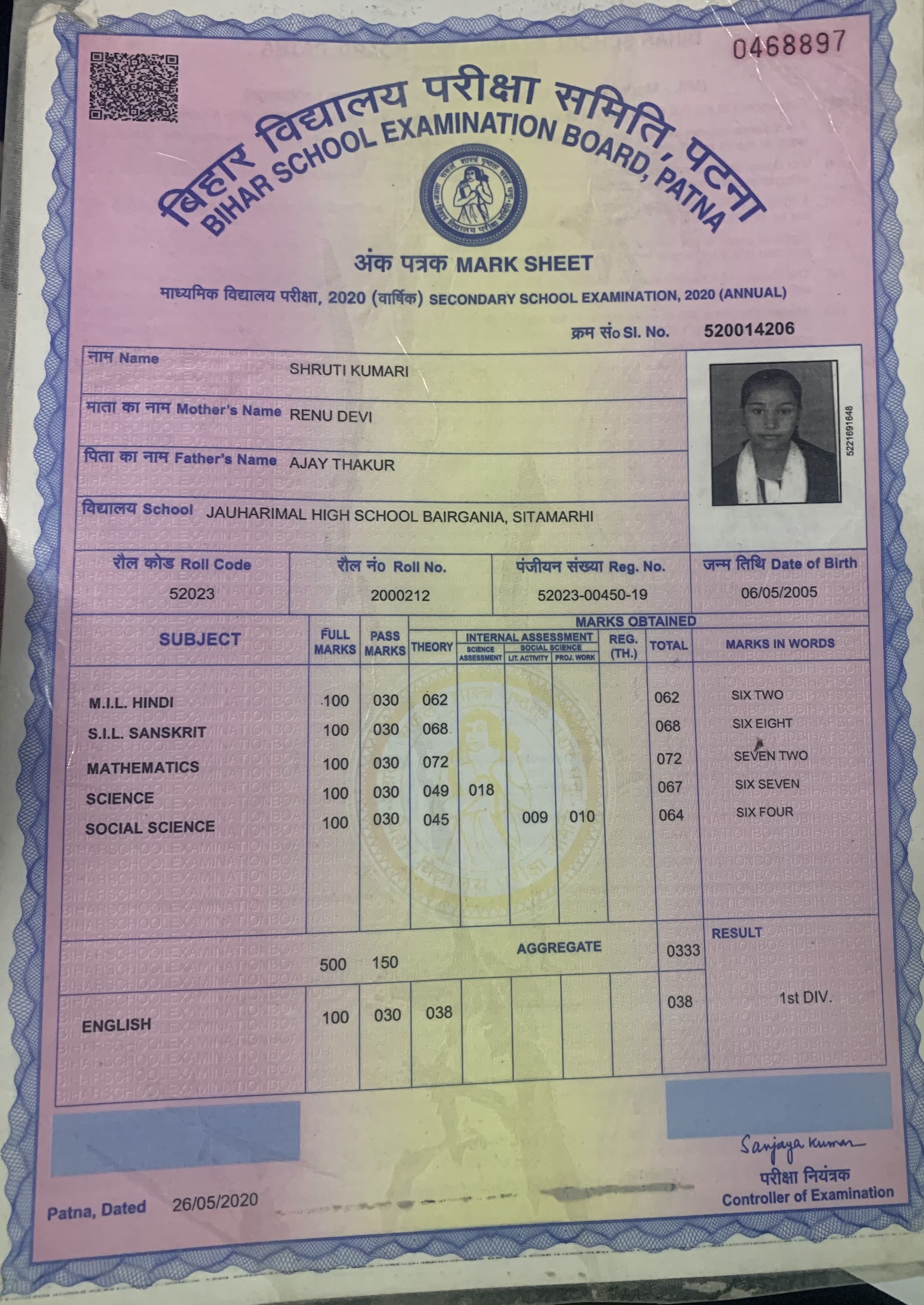 | Exam | Full Marks | Pass Marks | Marks Obtained |