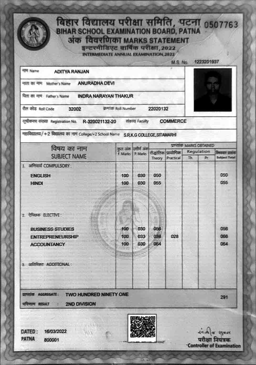 | Exam | Full Marks | Pass Marks | Marks Obtained |