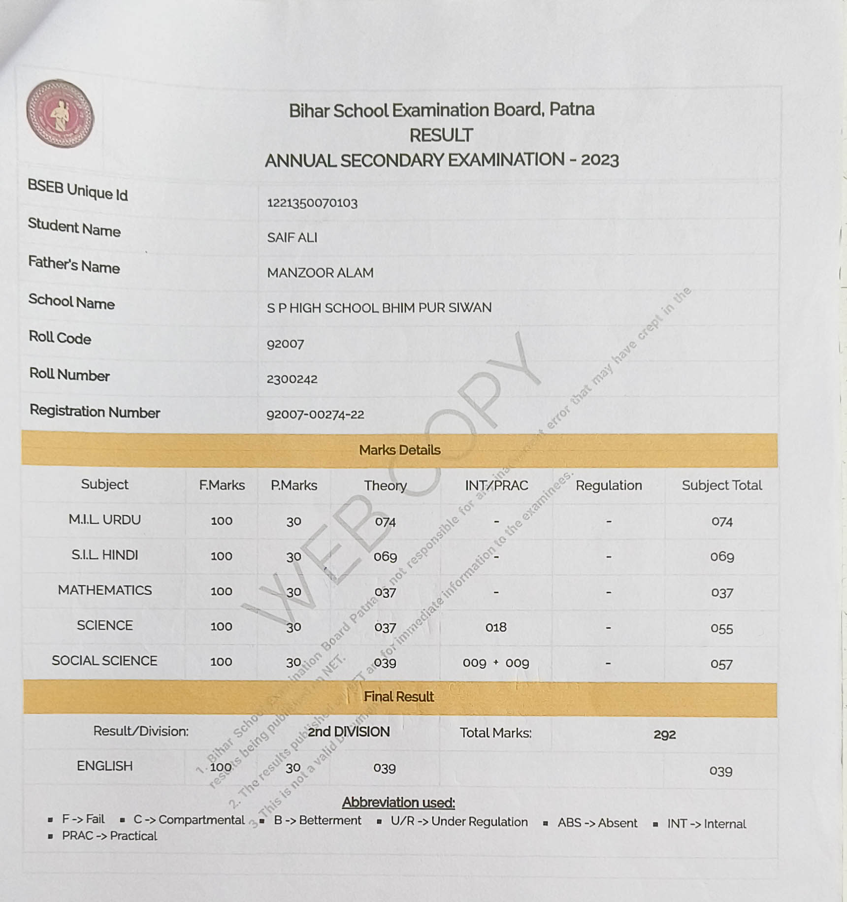 | Exam | Full Marks | Pass Marks | Marks Obtained |