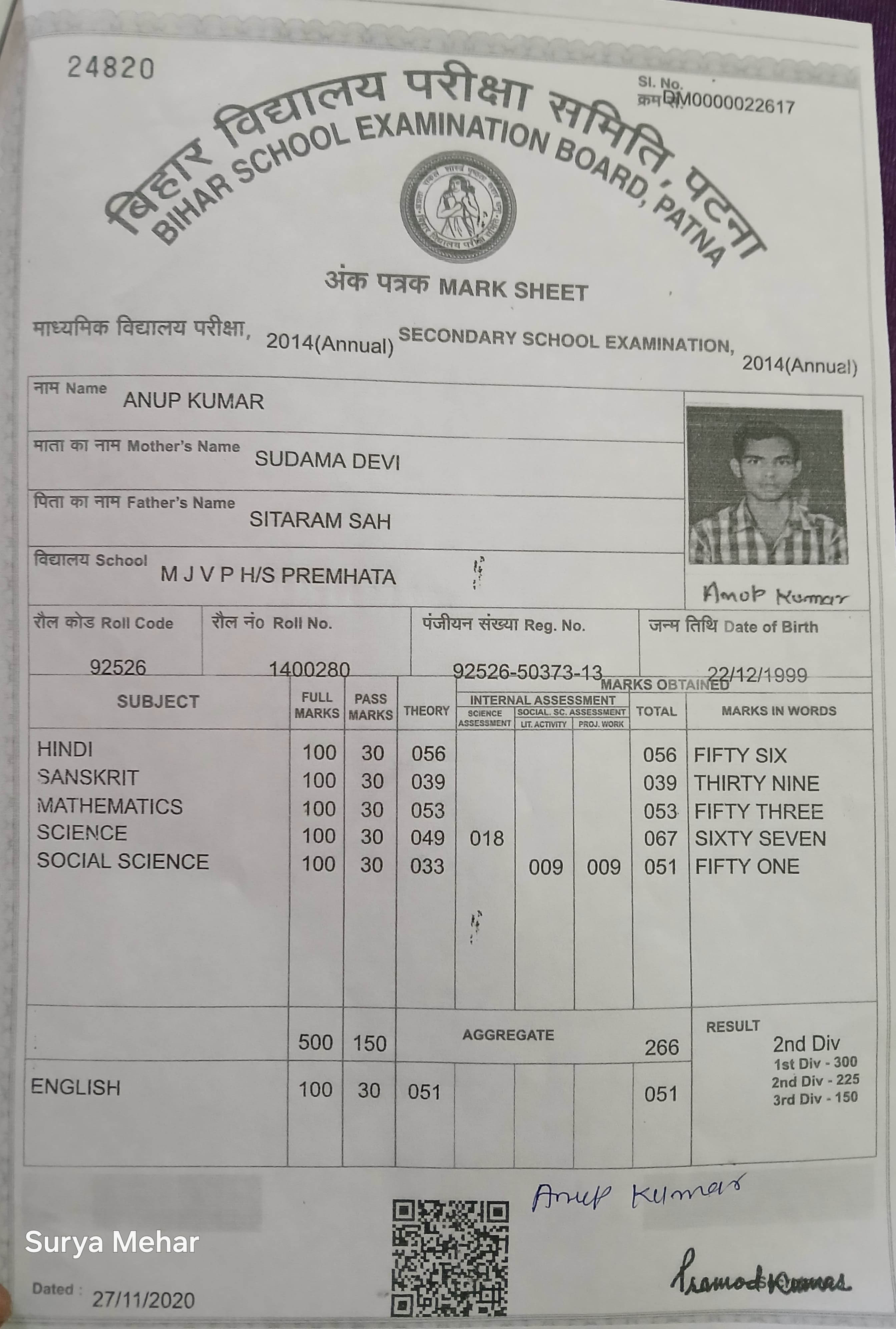| Exam | Full Marks | Pass Marks | Marks Obtained |