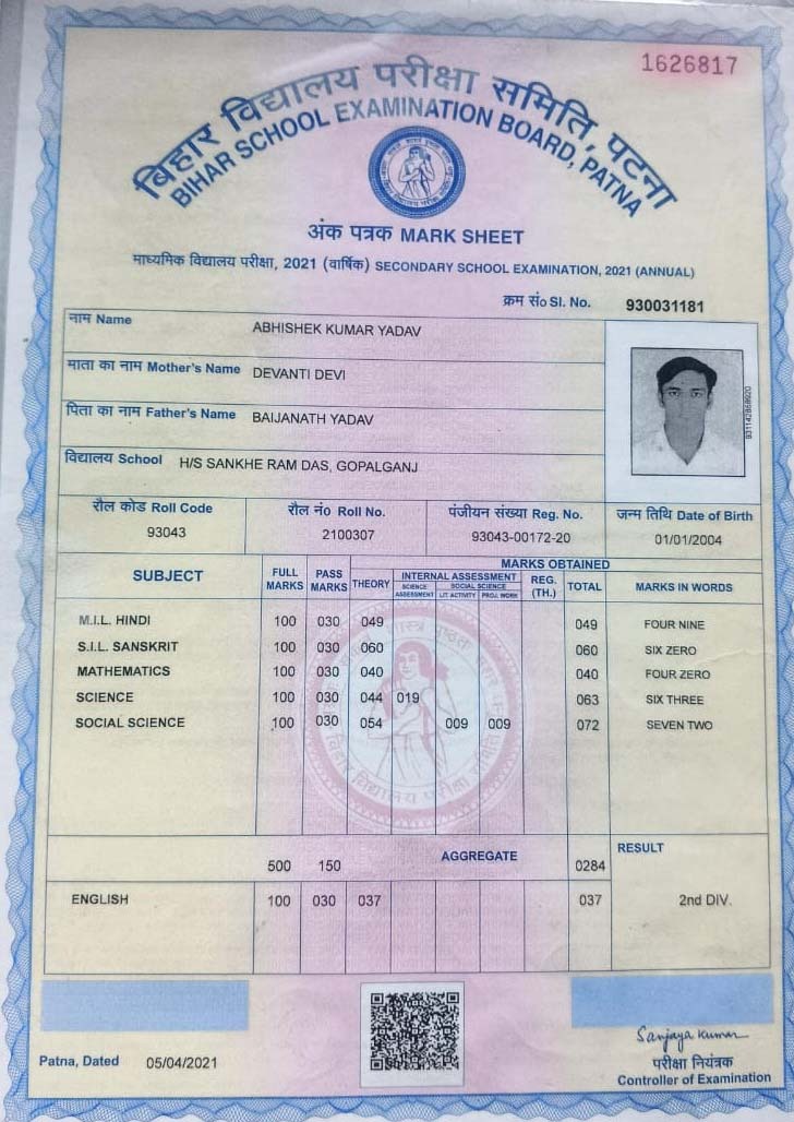 | Exam | Full Marks | Pass Marks | Marks Obtained |