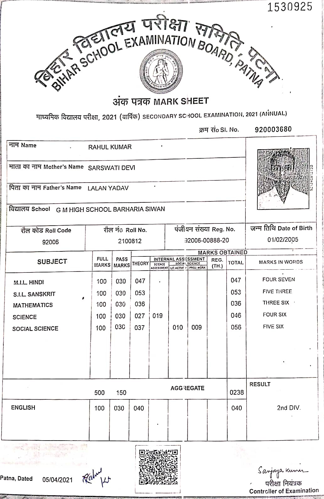 | Exam | Full Marks | Pass Marks | Marks Obtained |