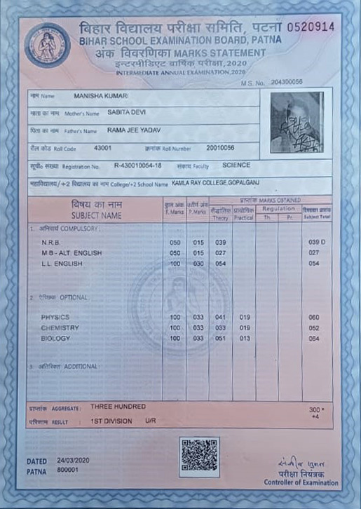 | Exam | Full Marks | Pass Marks | Marks Obtained |