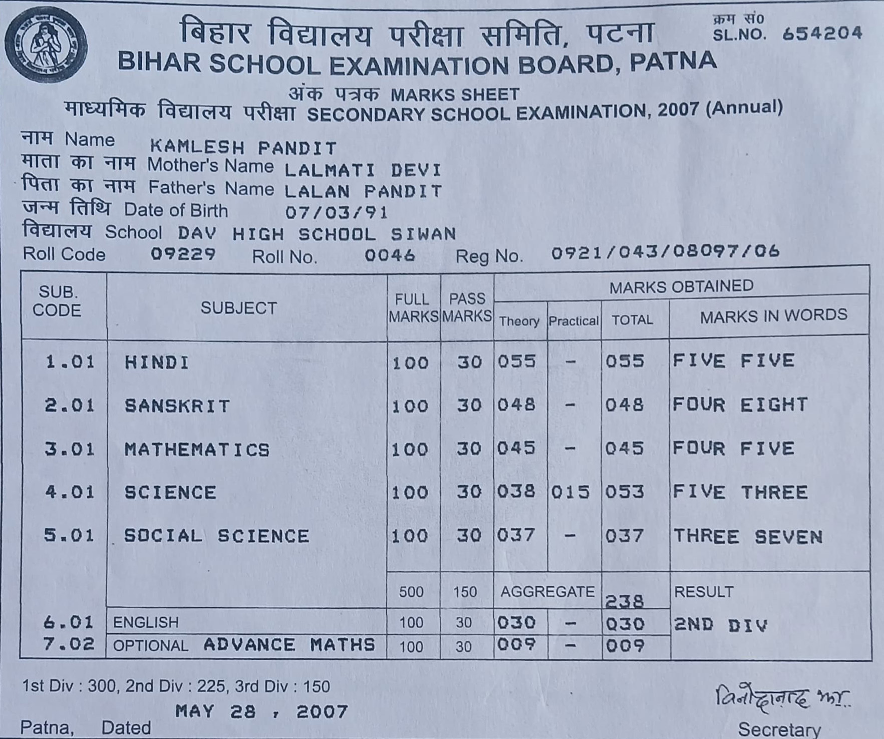 | Exam | Full Marks | Pass Marks | Marks Obtained |