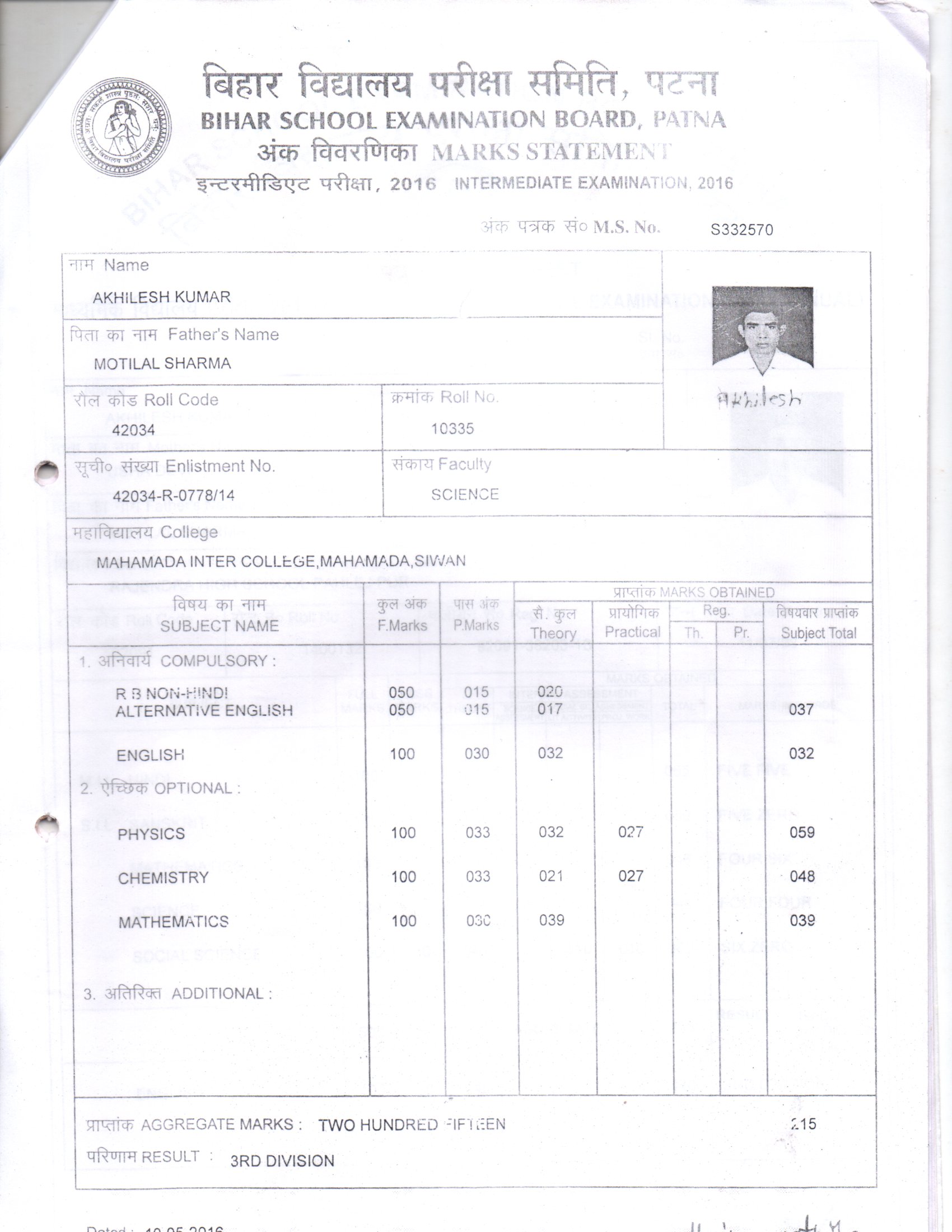 | Exam | Full Marks | Pass Marks | Marks Obtained |
