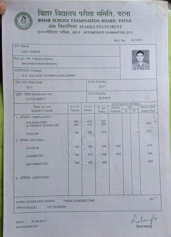 | Exam | Full Marks | Pass Marks | Marks Obtained |