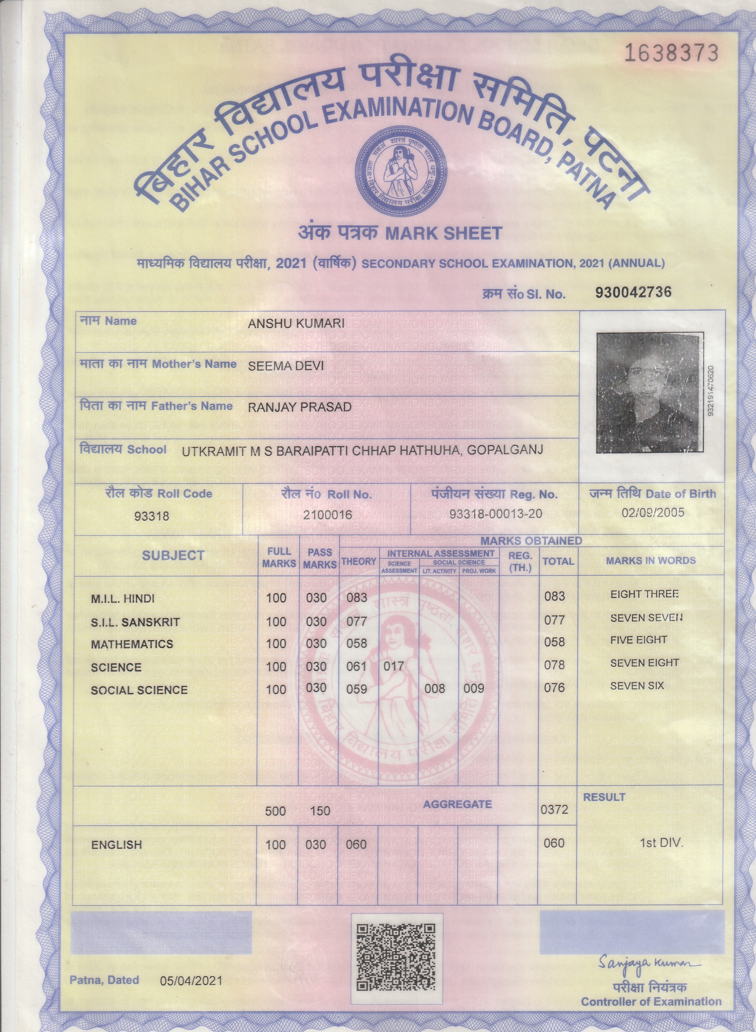 | Exam | Full Marks | Pass Marks | Marks Obtained |