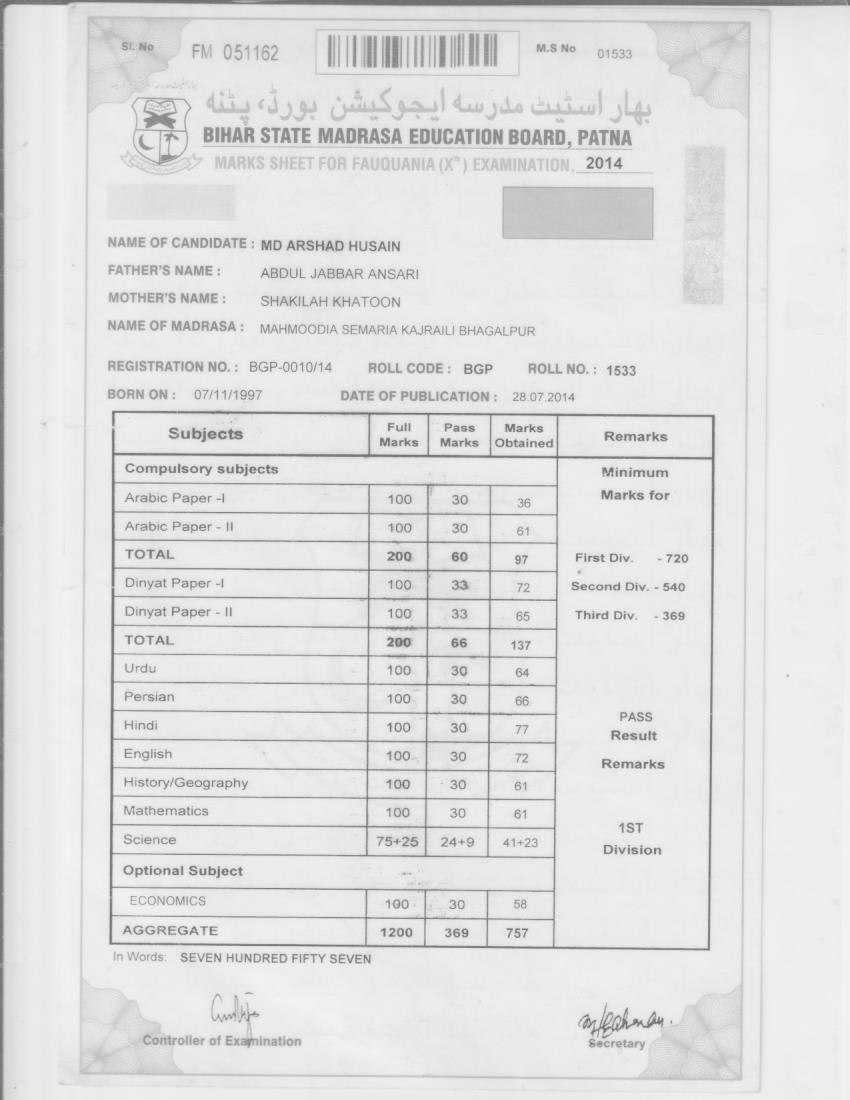 | Exam | Full Marks | Pass Marks | Marks Obtained |