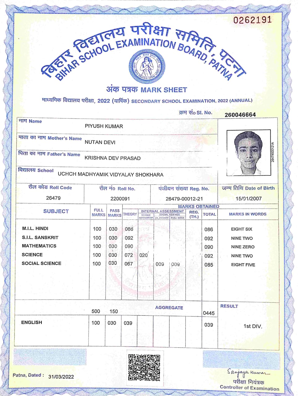 | Exam | Full Marks | Pass Marks | Marks Obtained |