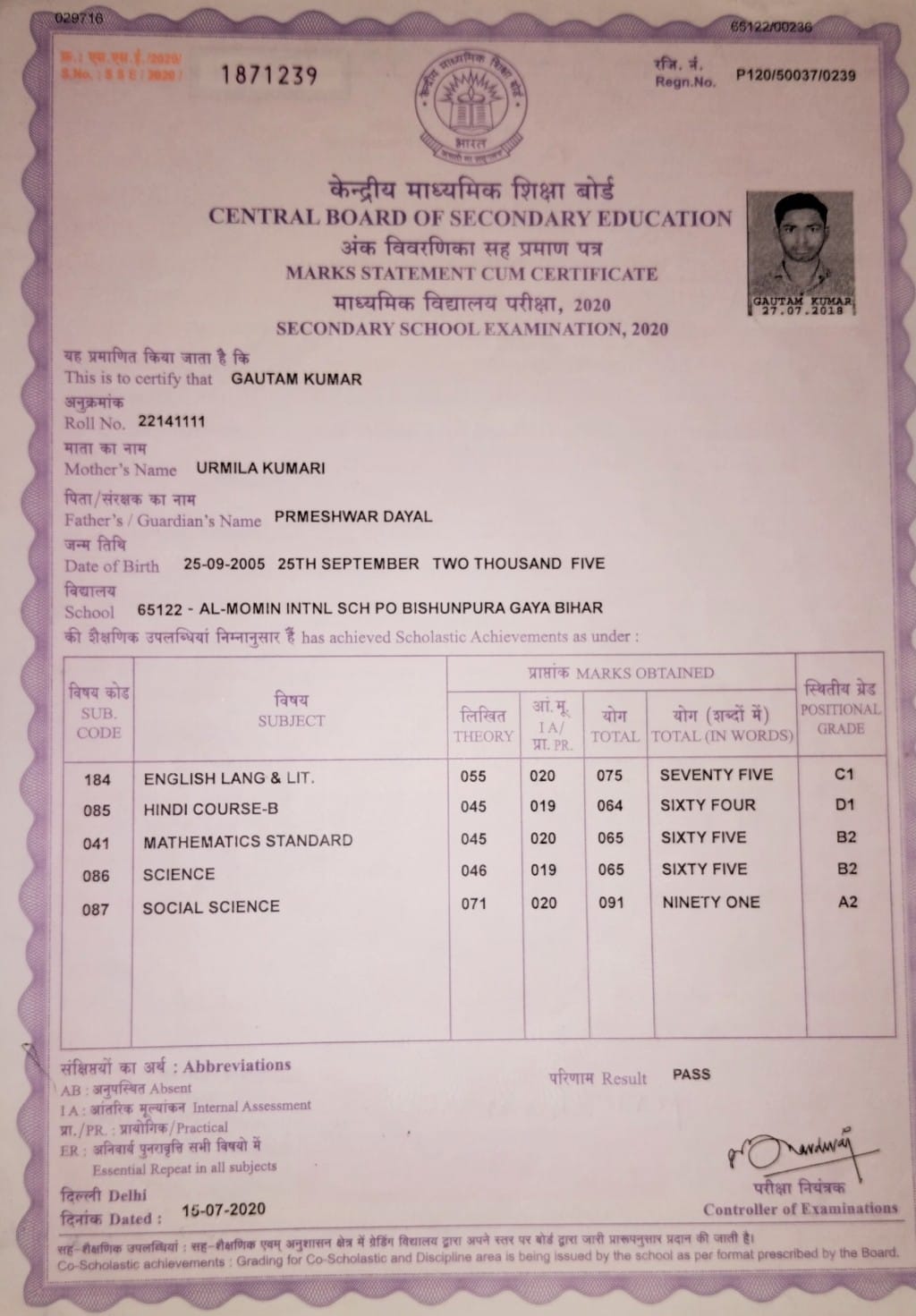 | Exam | Full Marks | Pass Marks | Marks Obtained |