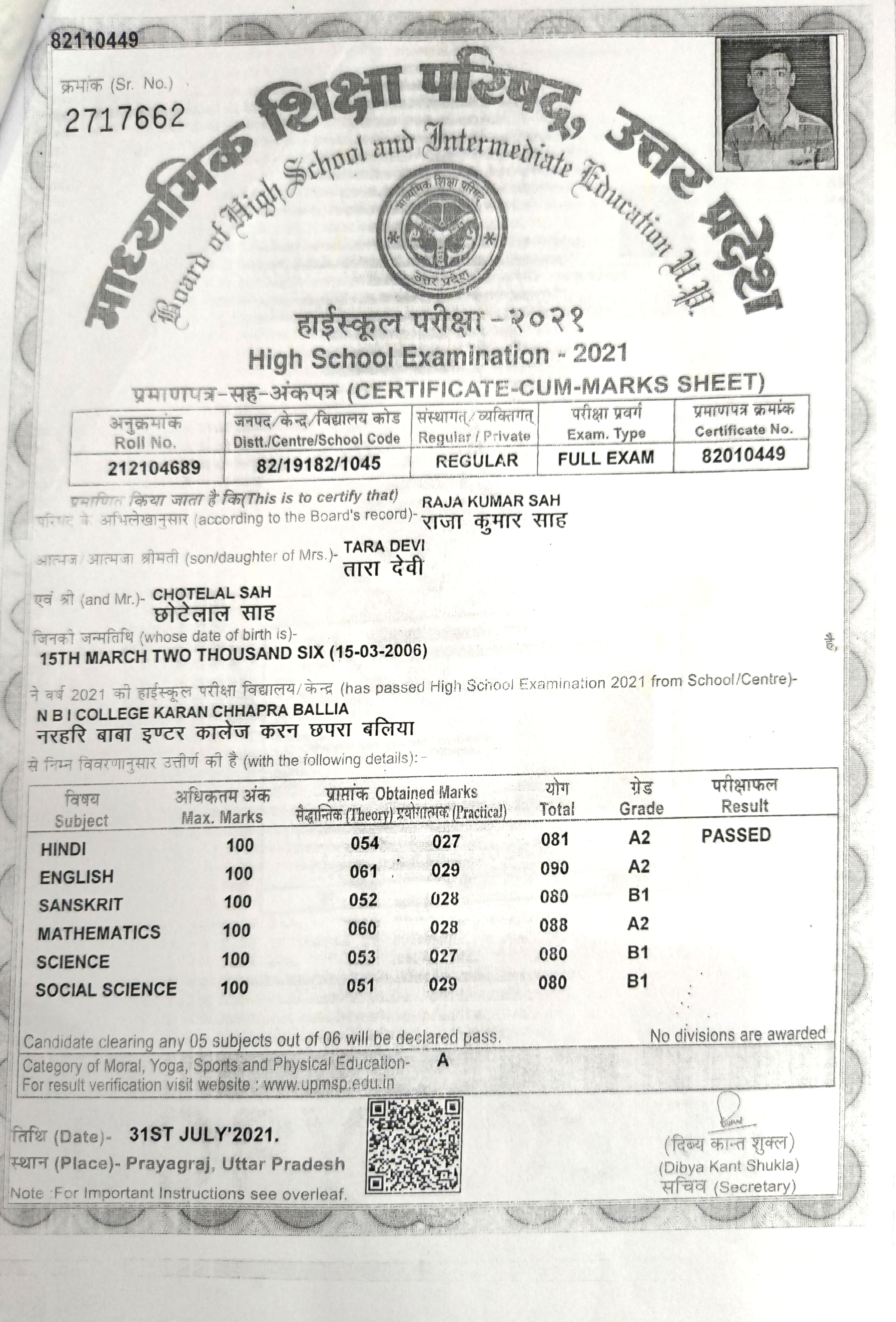 | Exam | Full Marks | Pass Marks | Marks Obtained |
