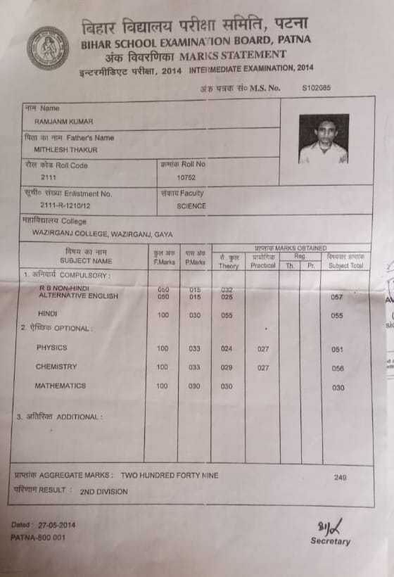 | Exam | Full Marks | Pass Marks | Marks Obtained |