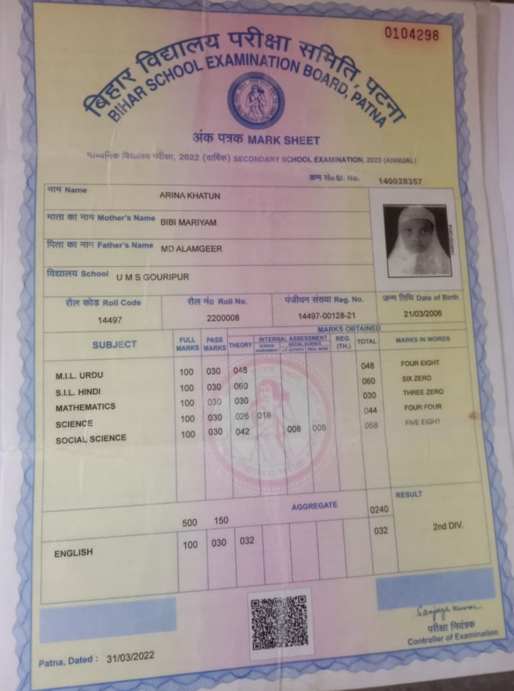 | Exam | Full Marks | Pass Marks | Marks Obtained |
