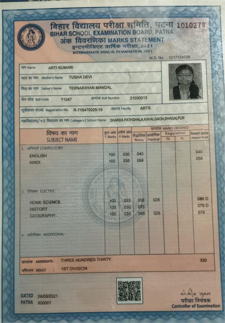 | Exam | Full Marks | Pass Marks | Marks Obtained |