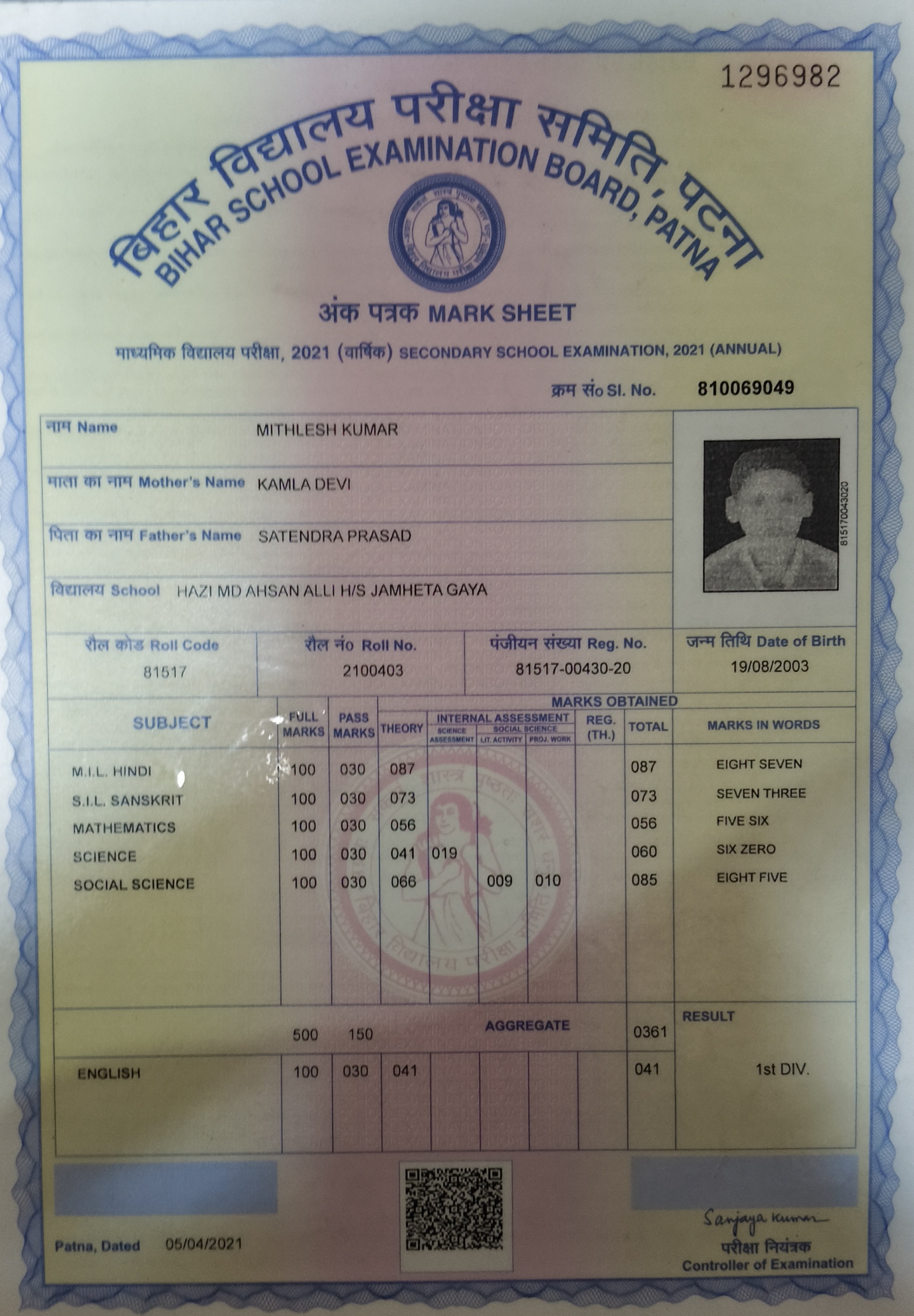| Exam | Full Marks | Pass Marks | Marks Obtained |