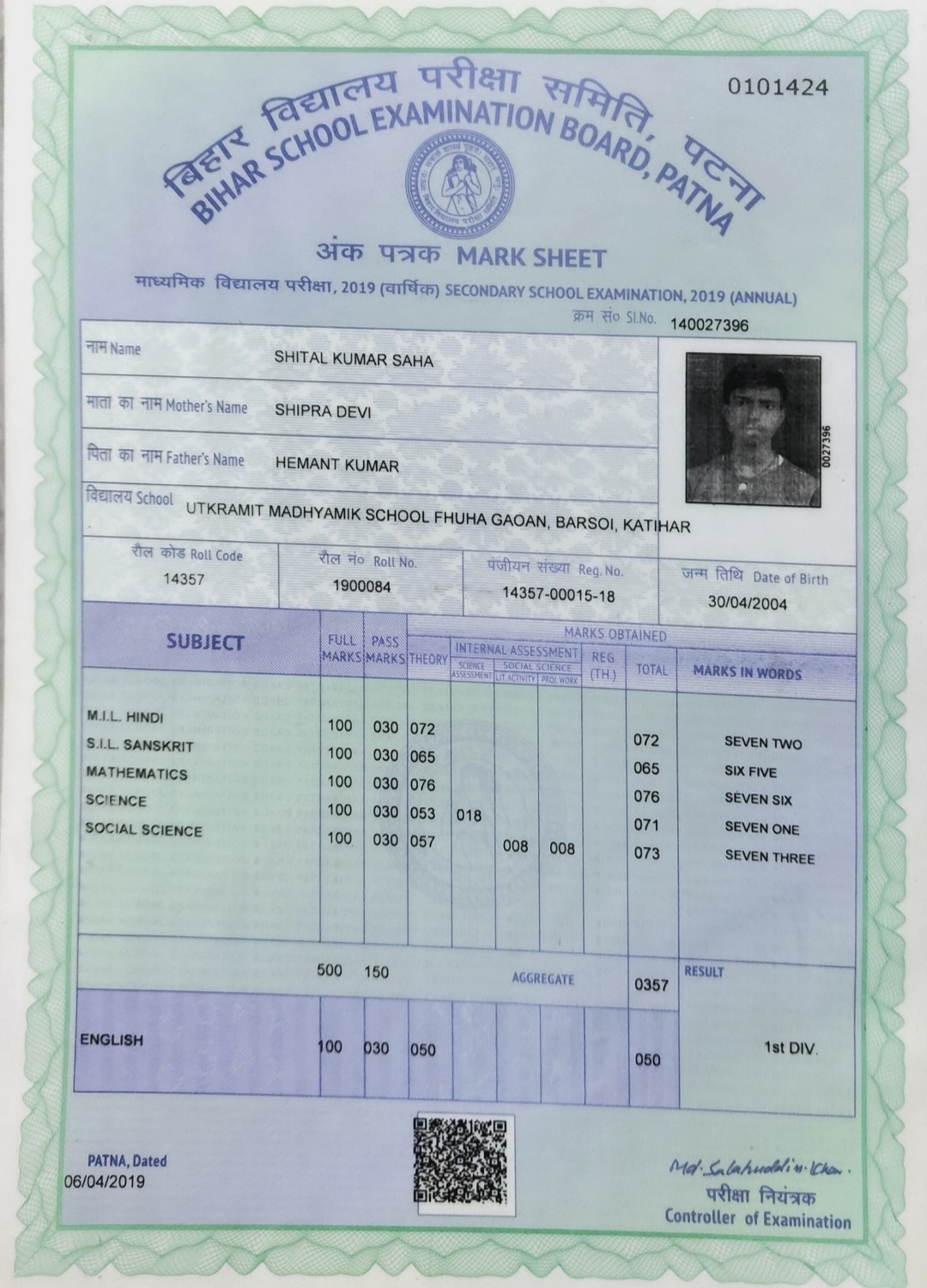 | Exam | Full Marks | Pass Marks | Marks Obtained |