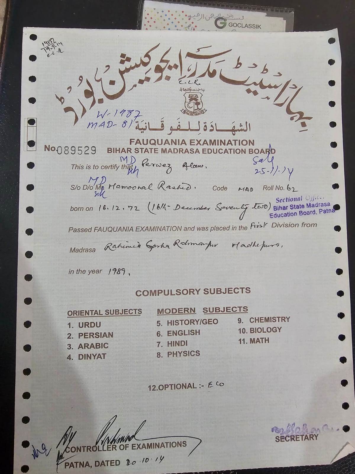 | Exam | Full Marks | Pass Marks | Marks Obtained |