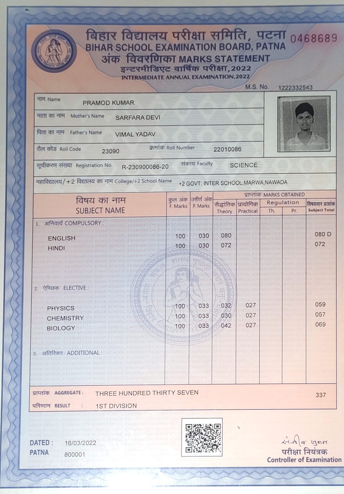 | Exam | Full Marks | Pass Marks | Marks Obtained |