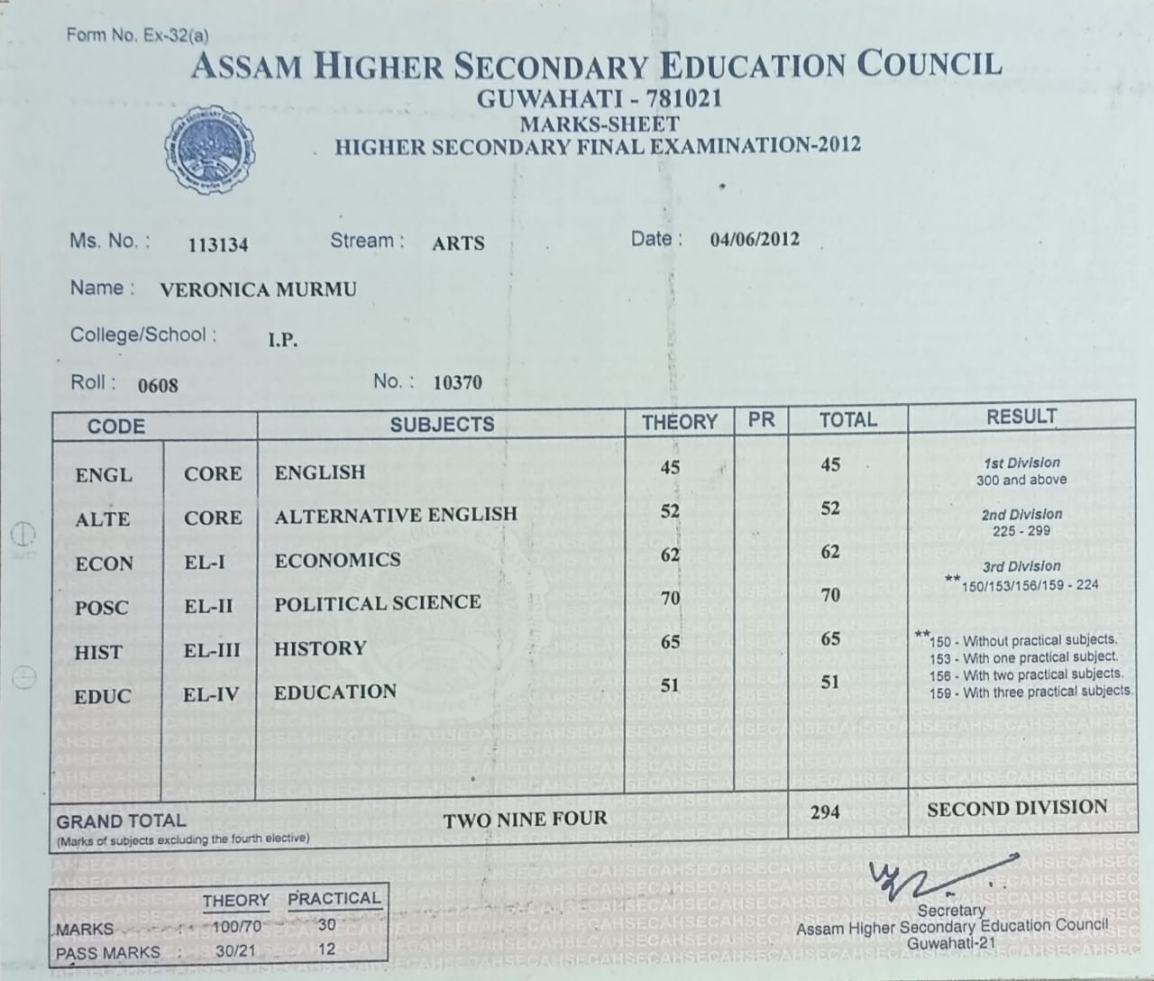 | Exam | Full Marks | Pass Marks | Marks Obtained |