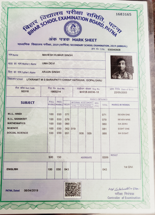 | Exam | Full Marks | Pass Marks | Marks Obtained |