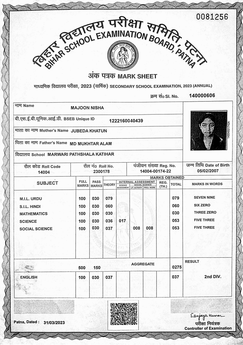 | Exam | Full Marks | Pass Marks | Marks Obtained |