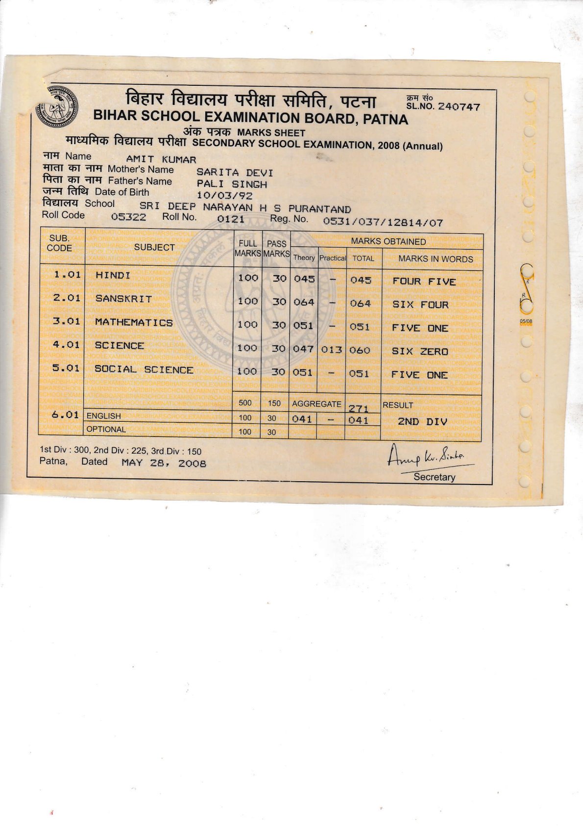 | Exam | Full Marks | Pass Marks | Marks Obtained |