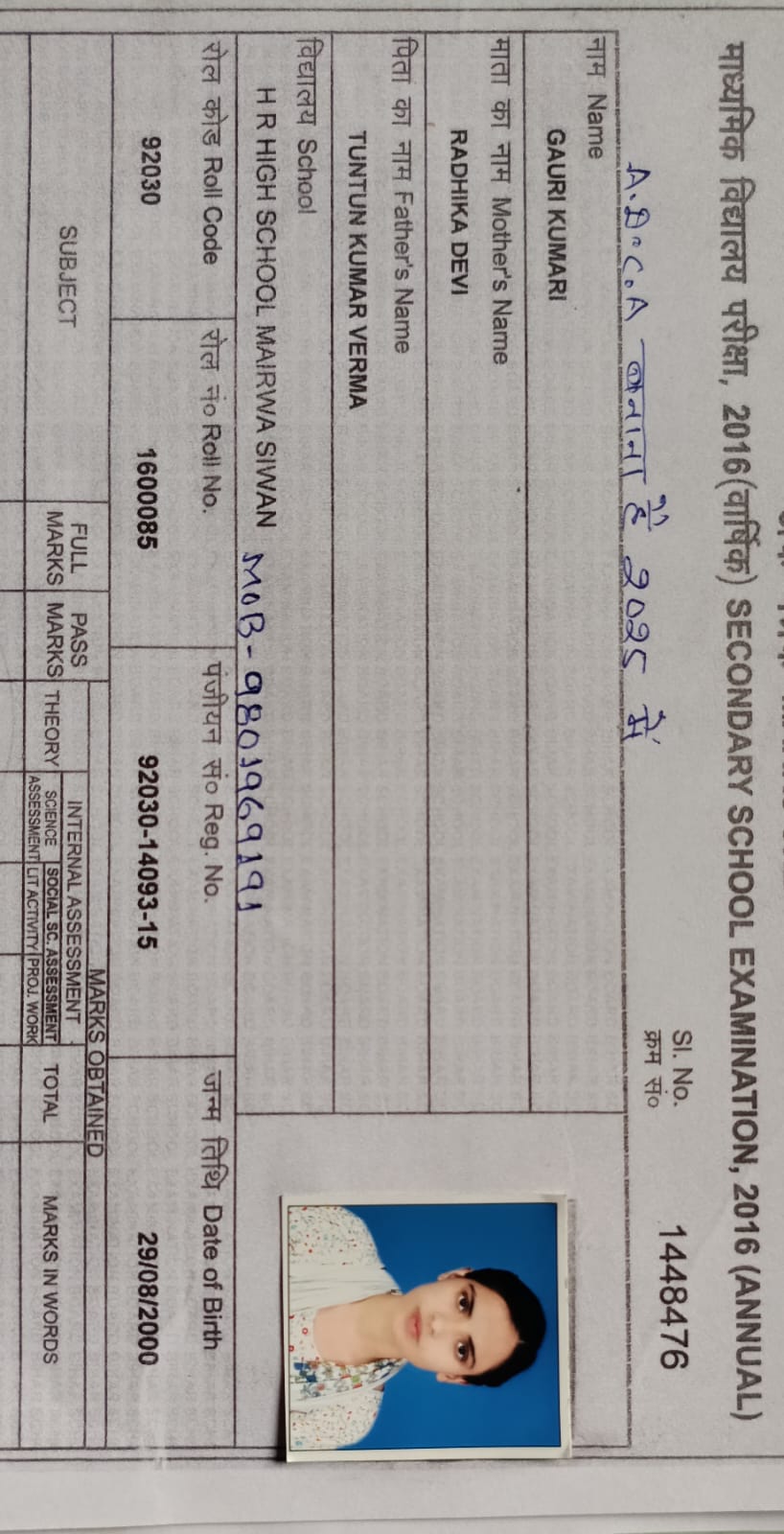 | Exam | Full Marks | Pass Marks | Marks Obtained |