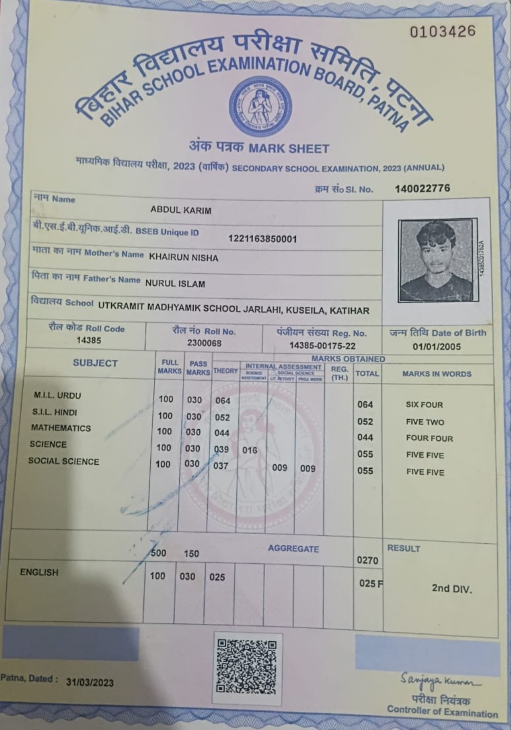 | Exam | Full Marks | Pass Marks | Marks Obtained |