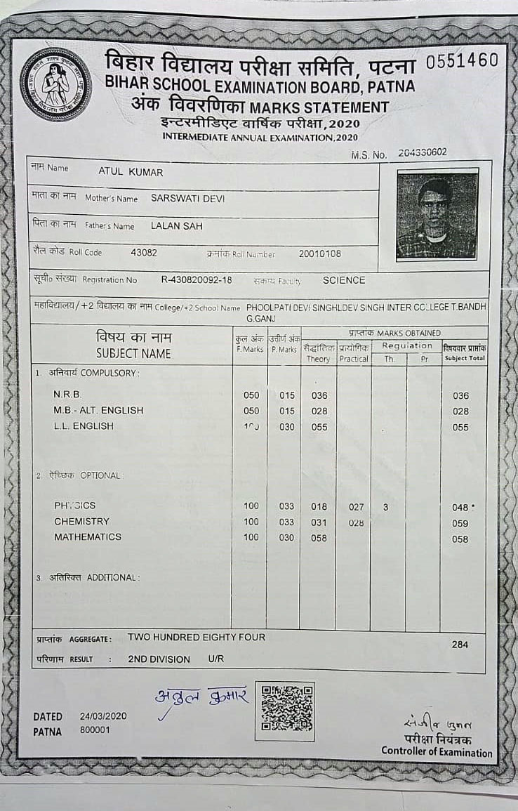 | Exam | Full Marks | Pass Marks | Marks Obtained |