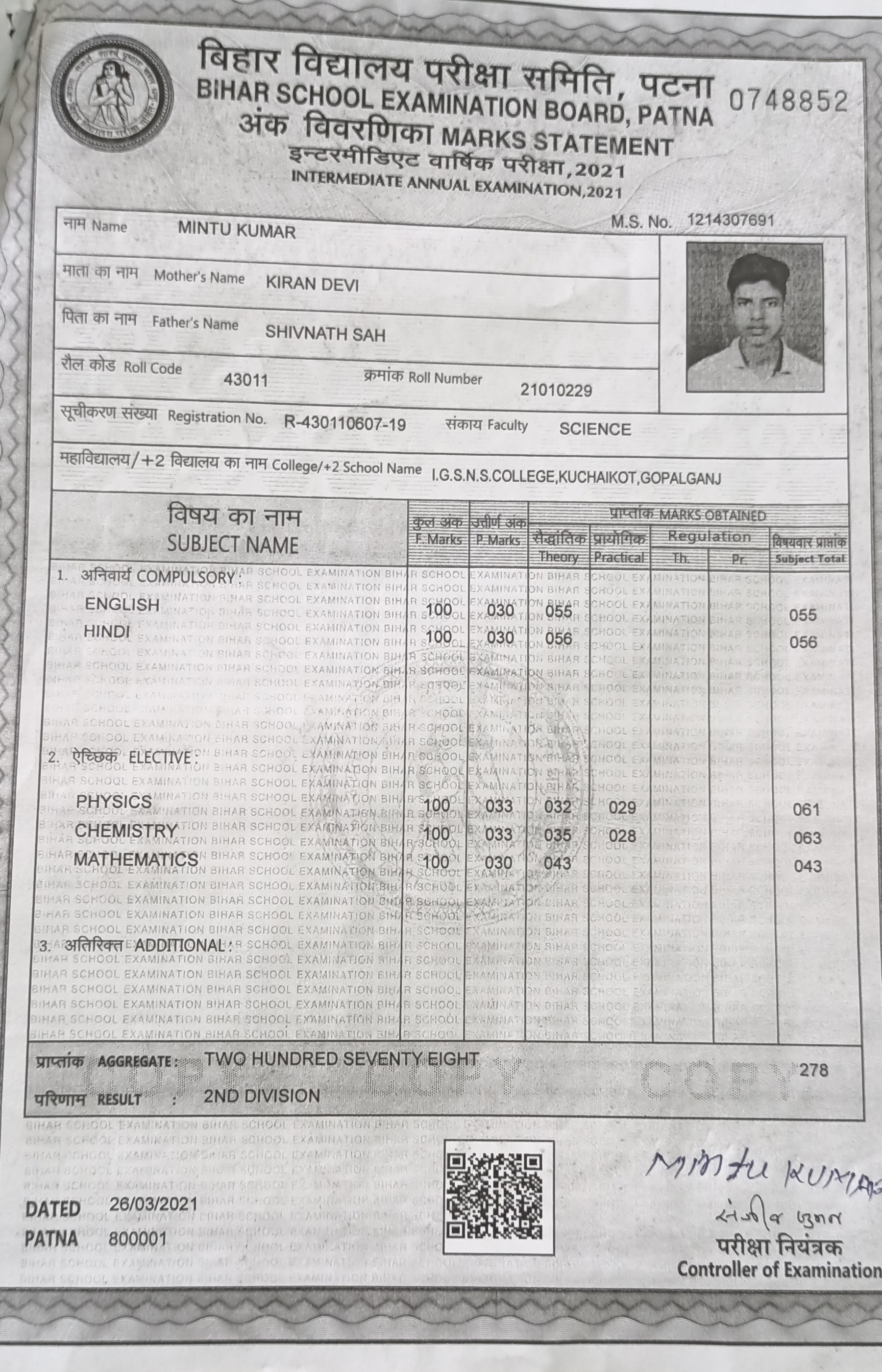 | Exam | Full Marks | Pass Marks | Marks Obtained |