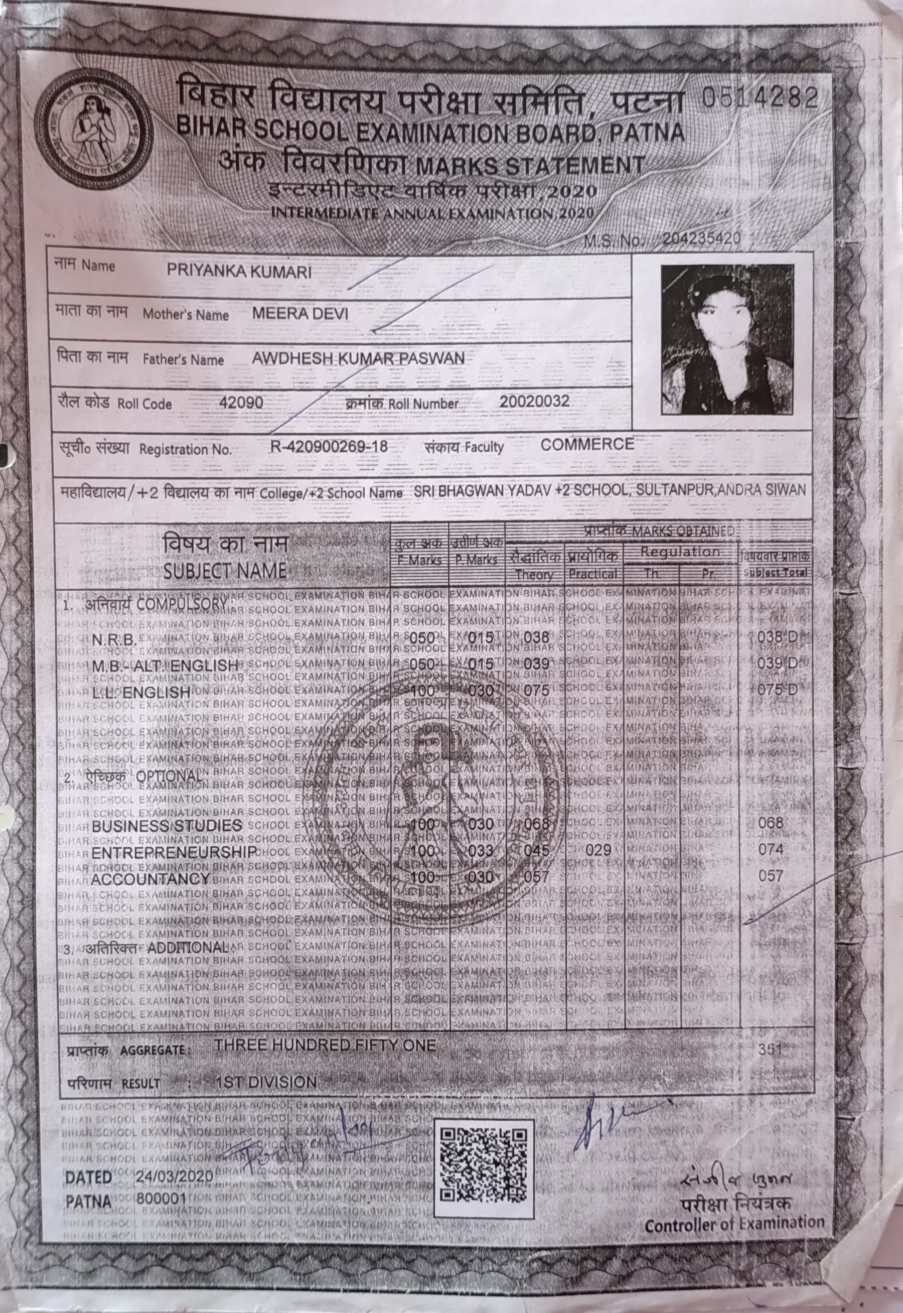 | Exam | Full Marks | Pass Marks | Marks Obtained |