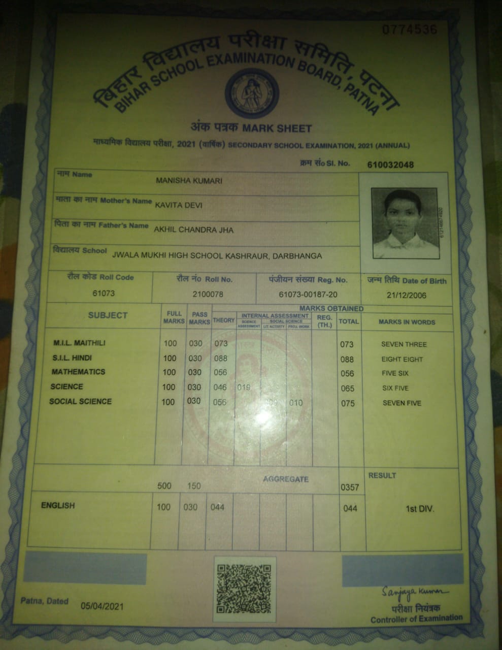 | Exam | Full Marks | Pass Marks | Marks Obtained |