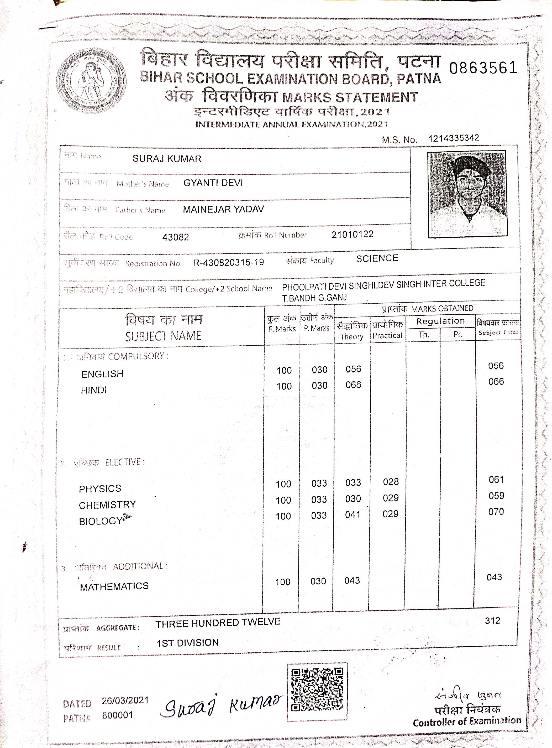 | Exam | Full Marks | Pass Marks | Marks Obtained |