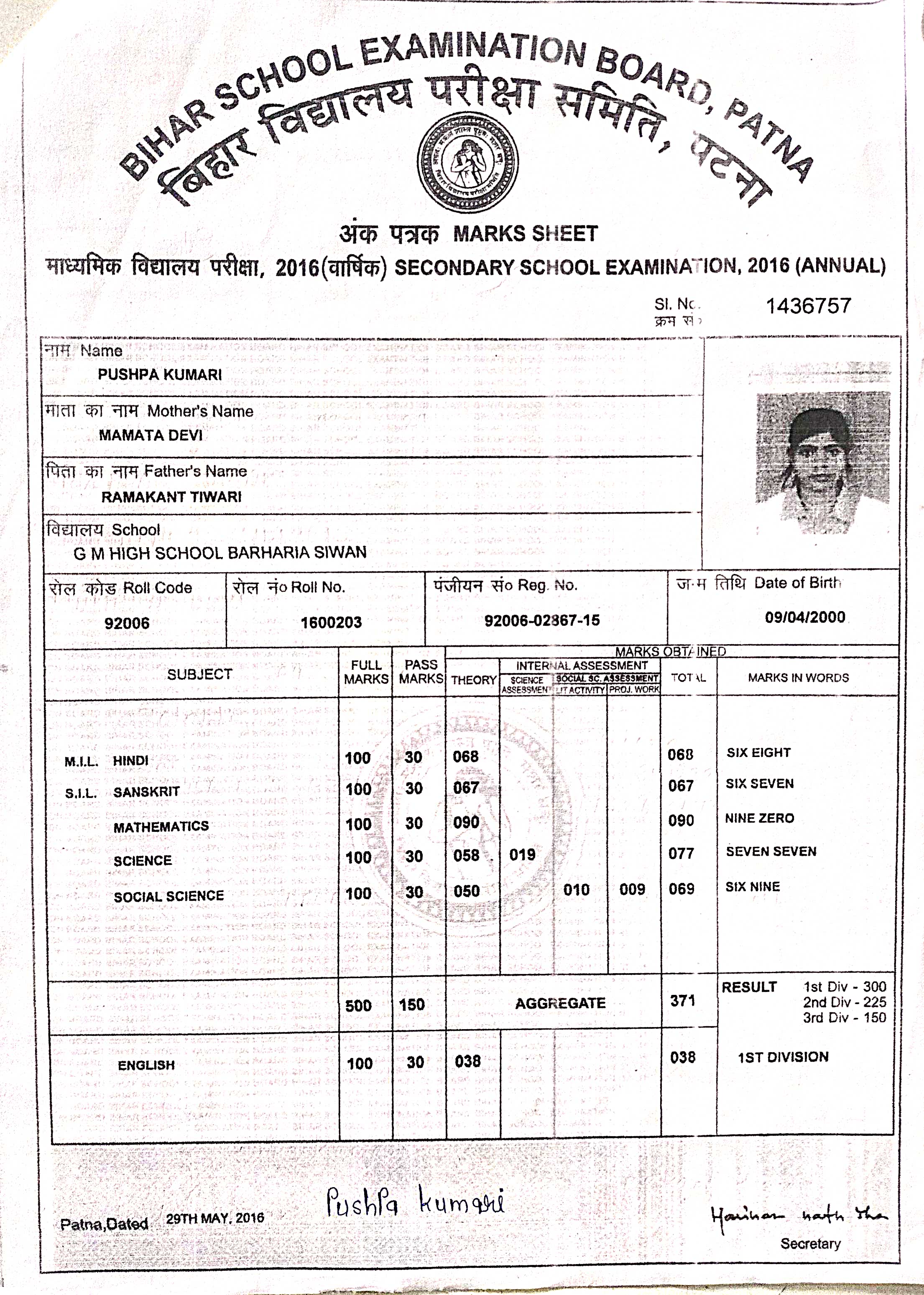 | Exam | Full Marks | Pass Marks | Marks Obtained |