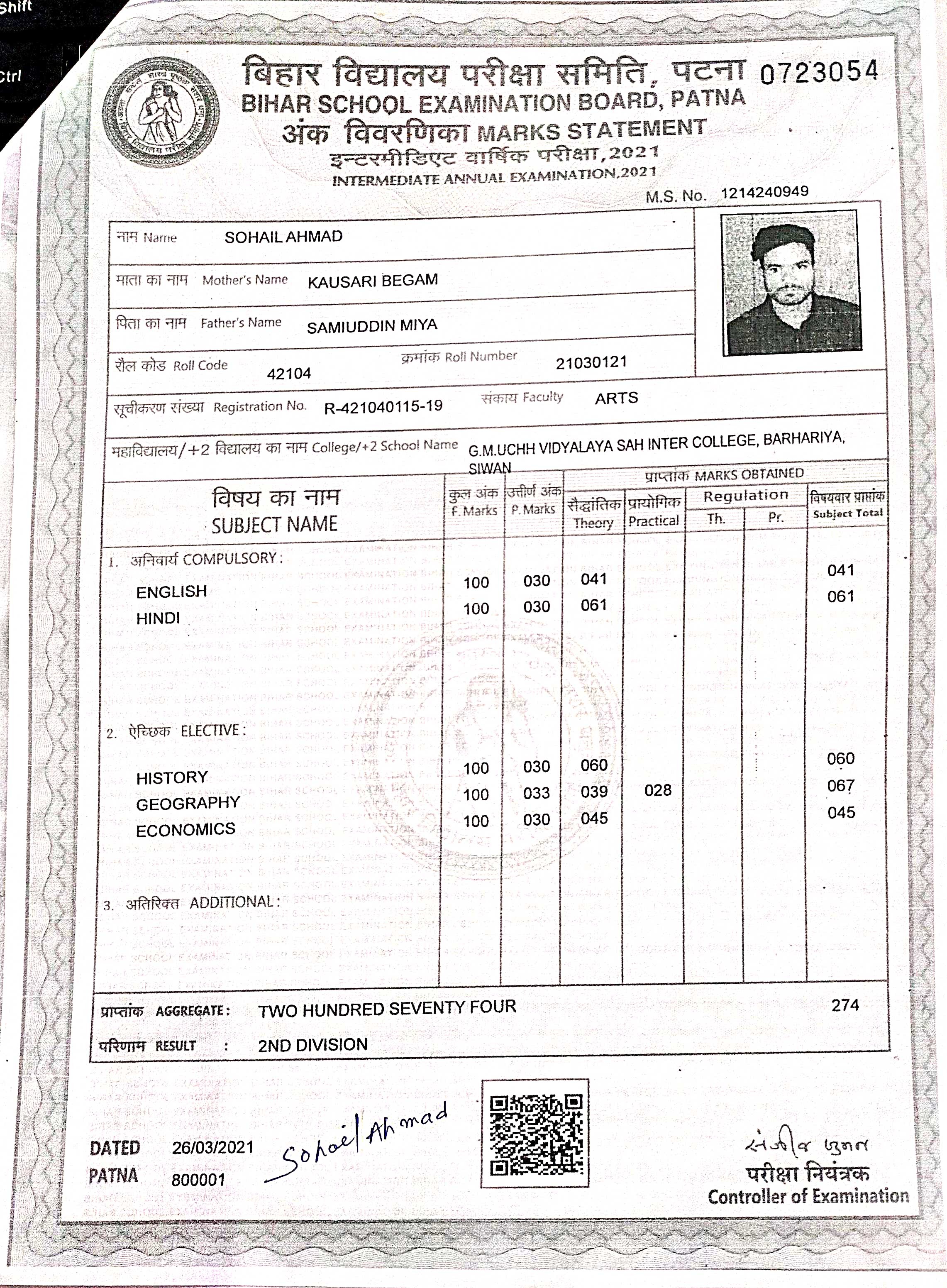 | Exam | Full Marks | Pass Marks | Marks Obtained |