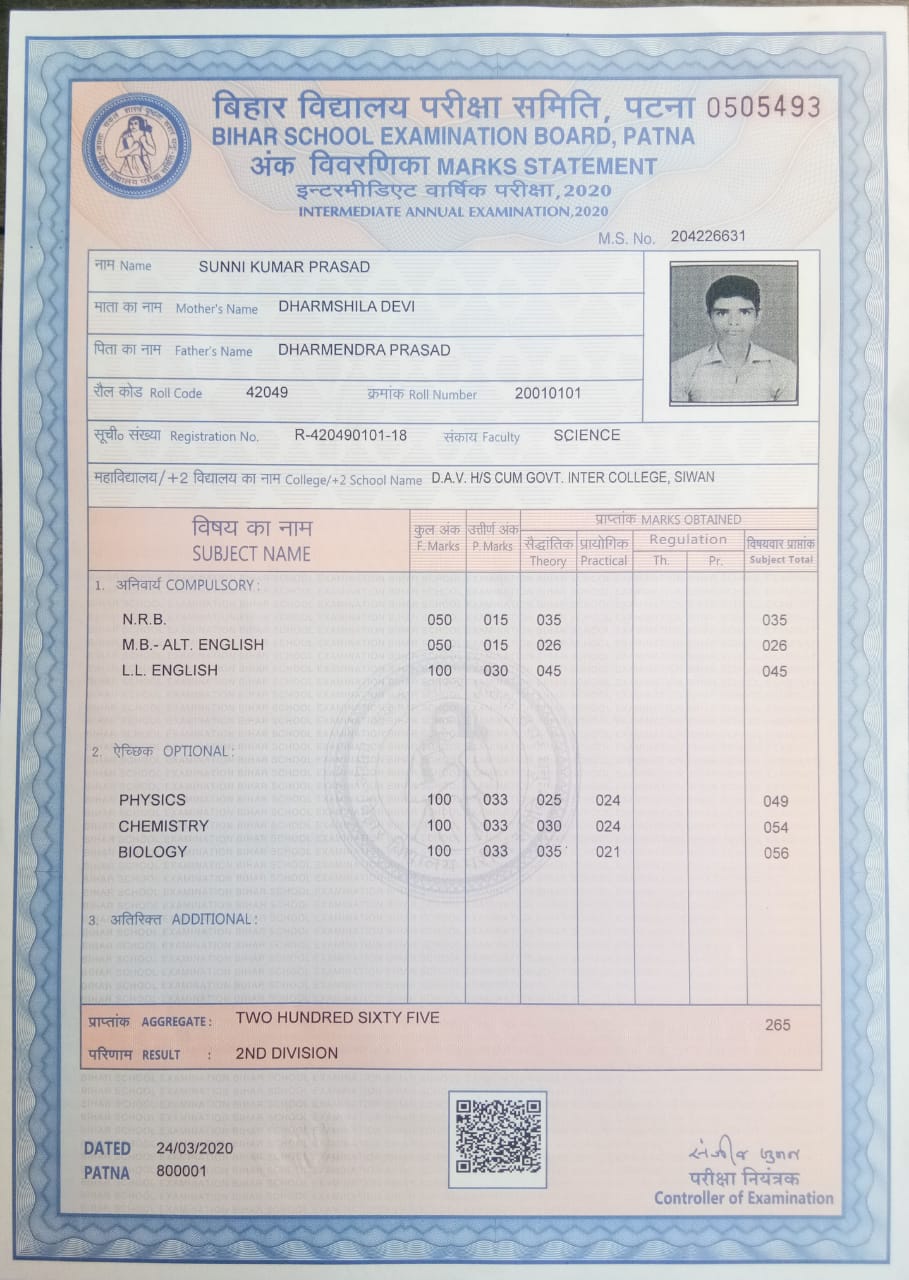 | Exam | Full Marks | Pass Marks | Marks Obtained |