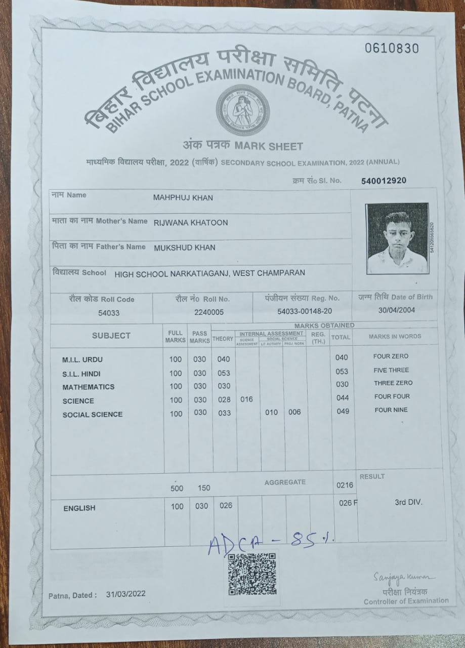 | Exam | Full Marks | Pass Marks | Marks Obtained |