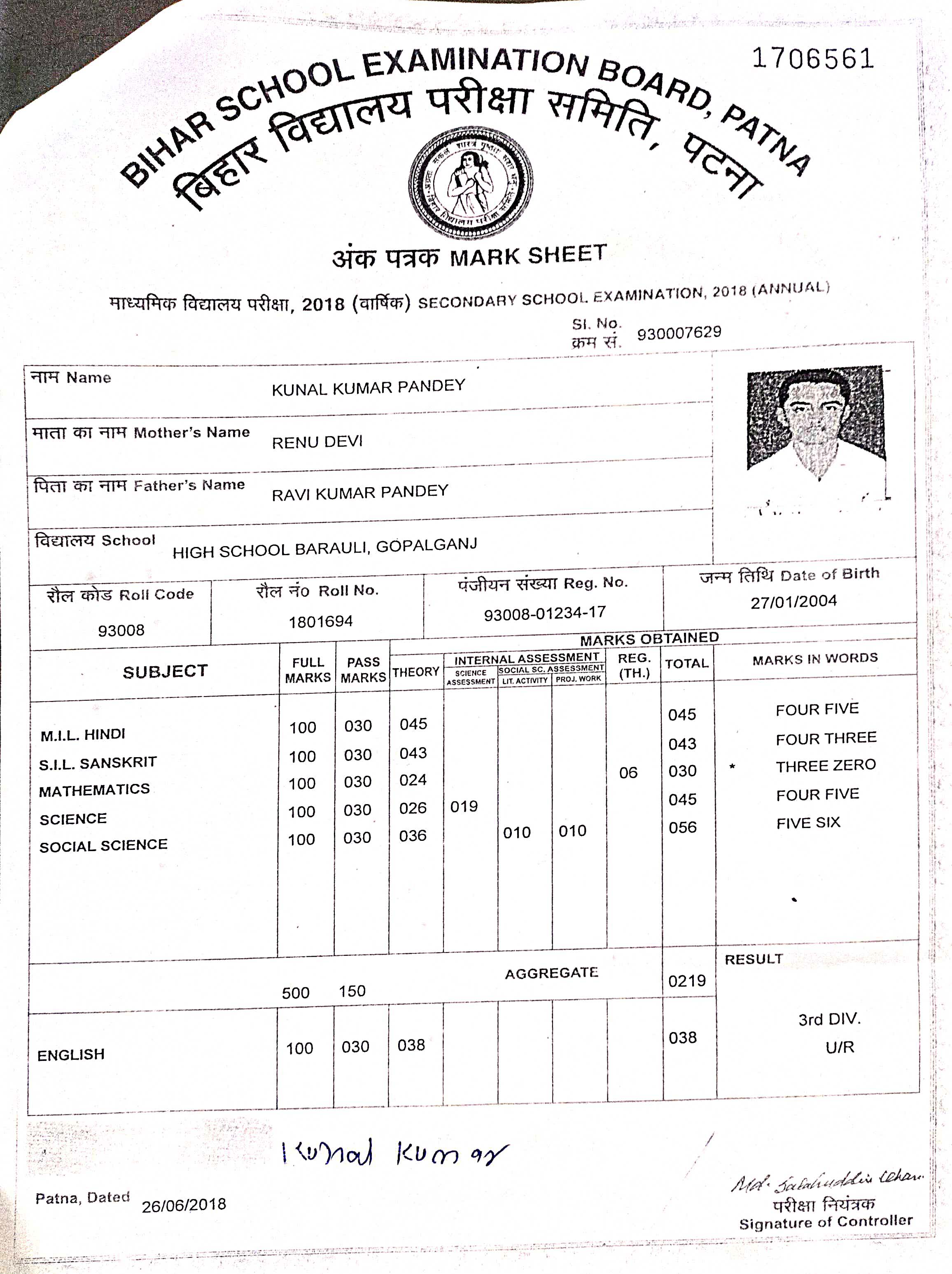| Exam | Full Marks | Pass Marks | Marks Obtained |