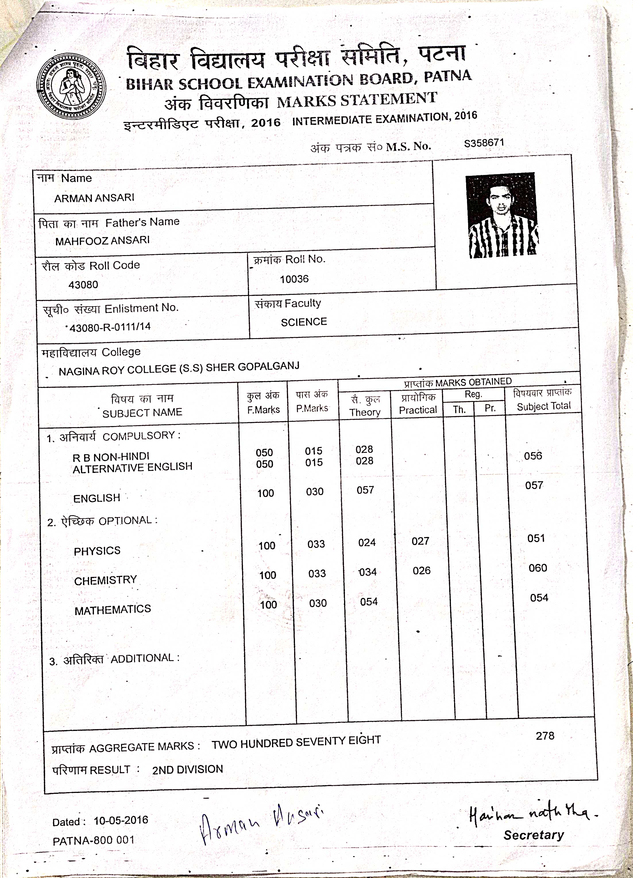 | Exam | Full Marks | Pass Marks | Marks Obtained |