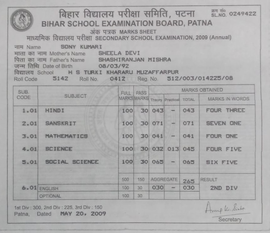 | Exam | Full Marks | Pass Marks | Marks Obtained |