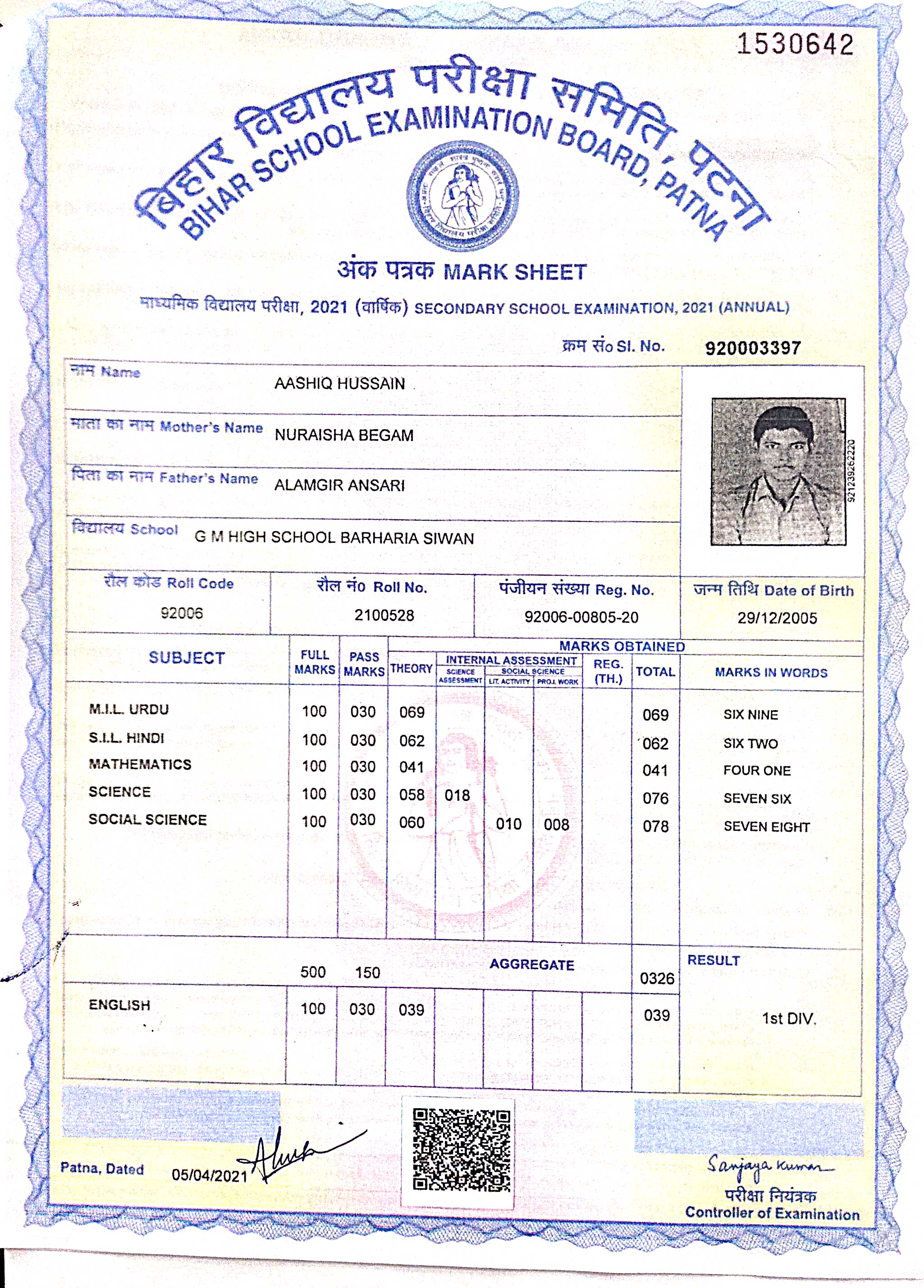 | Exam | Full Marks | Pass Marks | Marks Obtained |